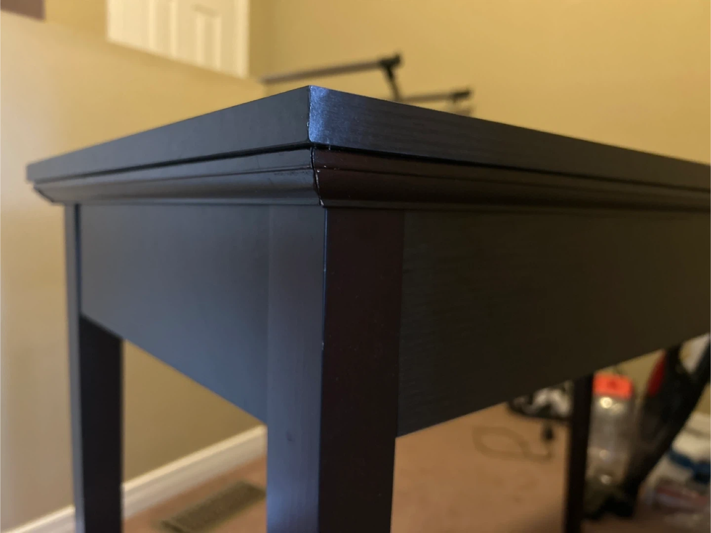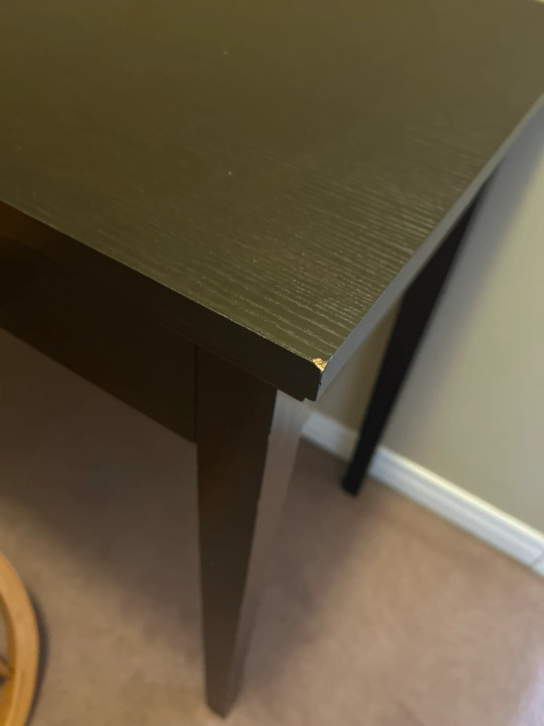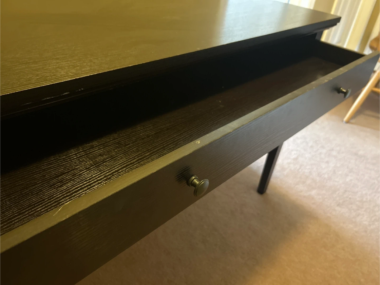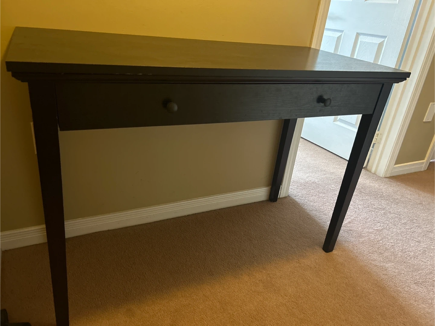 Dark brown wooden console table or small desk. Has a large drawer. In working condition with no issues (but has small dents- see photo)