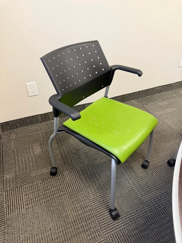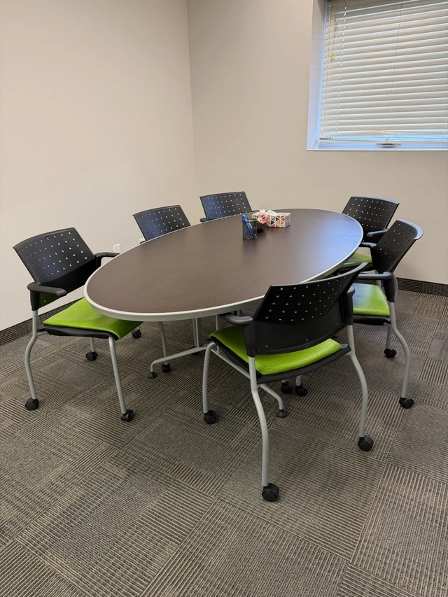 Oval small boardroom table with 6 chairs with armrests and wheels, measuring 7ft by 44.5” on the widest parts. The chairs are in good condition, other than the fabric of the cushions peeling. The base of the chairs can be removed, and you can easily put a new piece of material/fabric on them. The base of the table will need to be taken off for removal out of the office. Located behind Vaughan Mills.