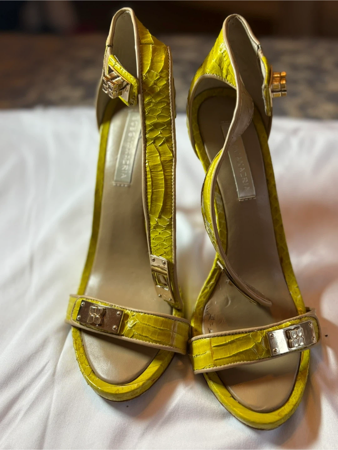 These BCBGMAXAZRIA stiletto heels are a vibrant yellow with a textured finish. They feature ankle straps with buckle closures. A stylish addition to any outfit!