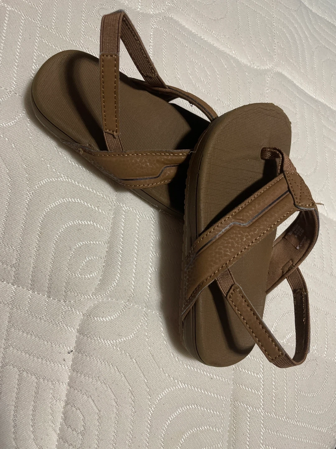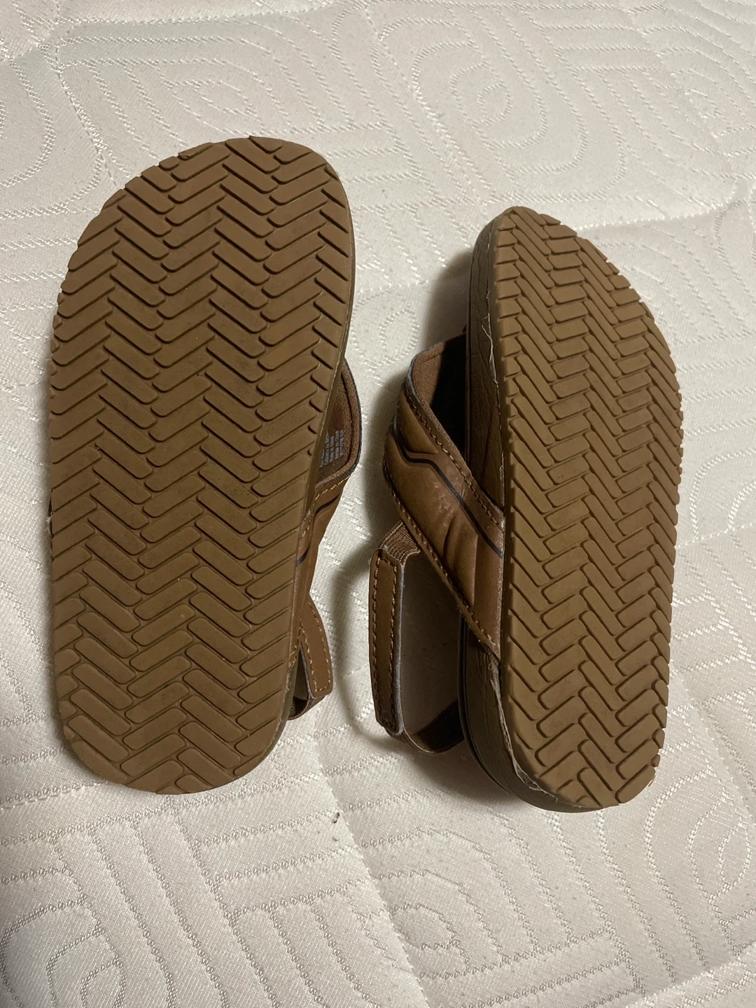 Selling a pair of brown leather sandals. They are size 7-8c (toddler) and in good condition. Perfect for casual wear!