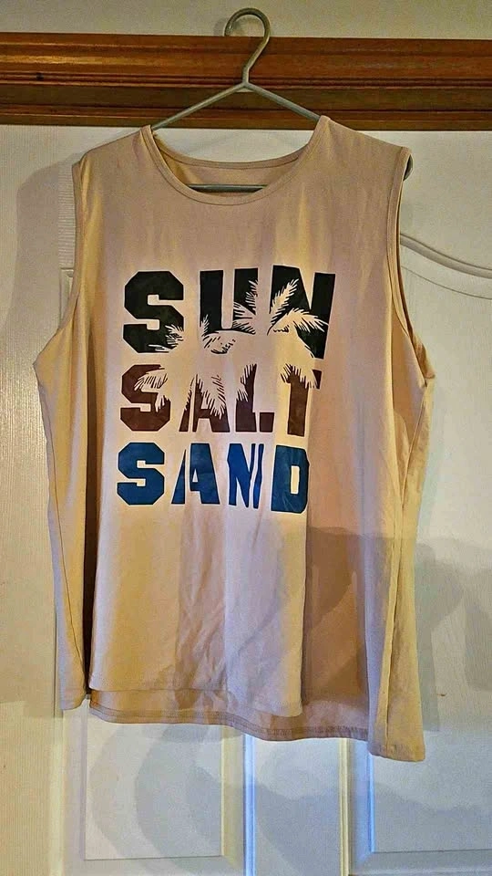 Comfy tank top with a 'Sun Salt Sand' graphic and palm trees. The shirt has black, brown, and blue colors with beige accents. Great for beach vibes or casual wear.