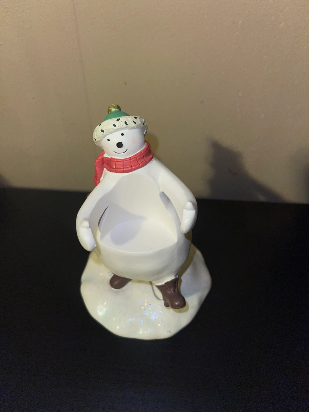 This decorative snowman figurine features a red scarf and a green hat. It's made of painted ceramic material. It sits on a sparkly white base. Perfect for adding a festive touch to your holiday decor!