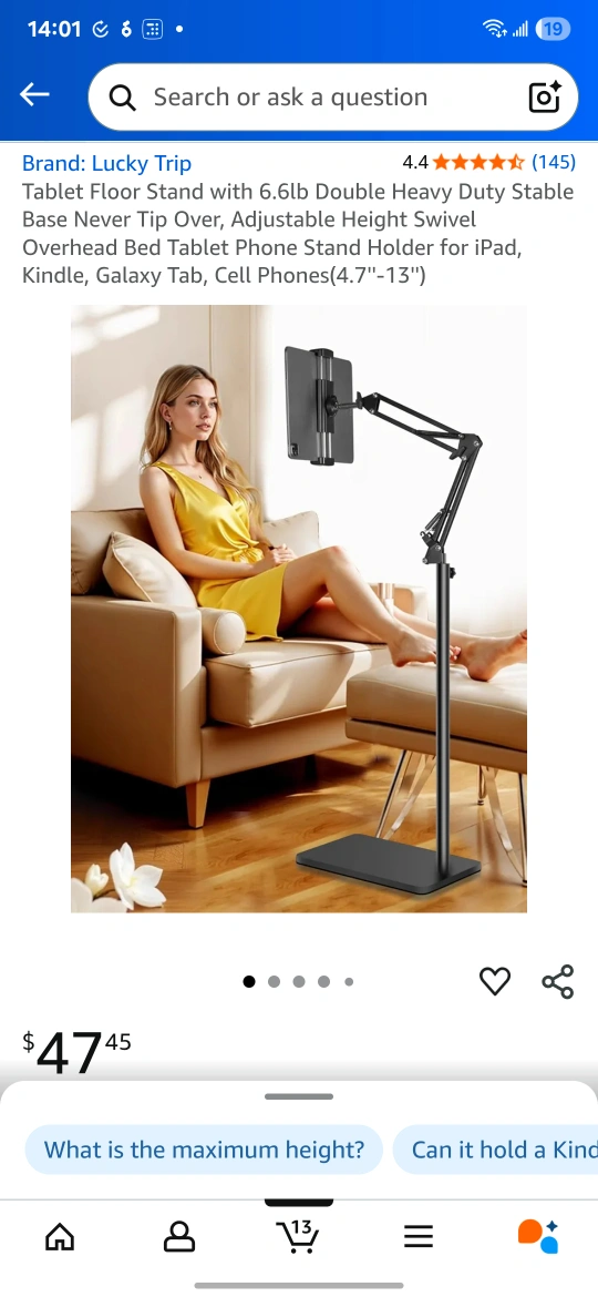 Selling a tablet floor stand that's in great condition! It's a Lucky Trip brand and features an adjustable height for comfortable viewing. The stand is sturdy and has a heavy-duty base for stability. Perfect for iPads, Kindles, Galaxy Tabs, and cell phones (4.7"-13")