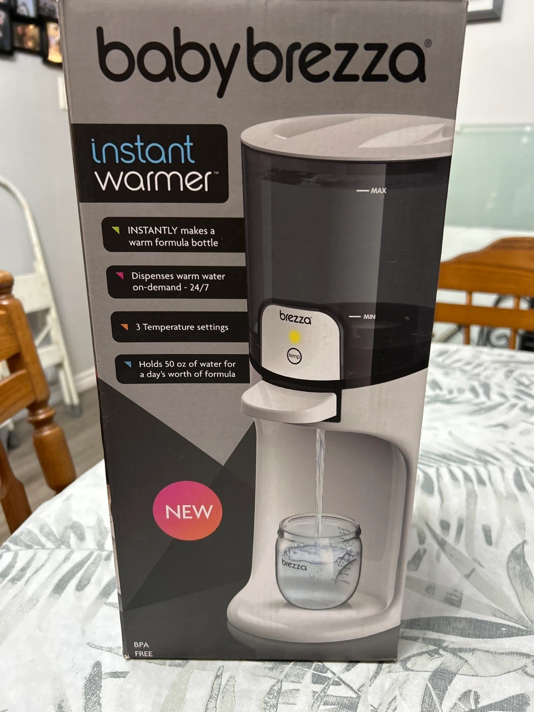 This Baby Brezza Instant Warmer quickly warms formula bottles. It dispenses warm water on-demand with 3 temperature settings. The water tank holds 50 oz and it's BPA-free.