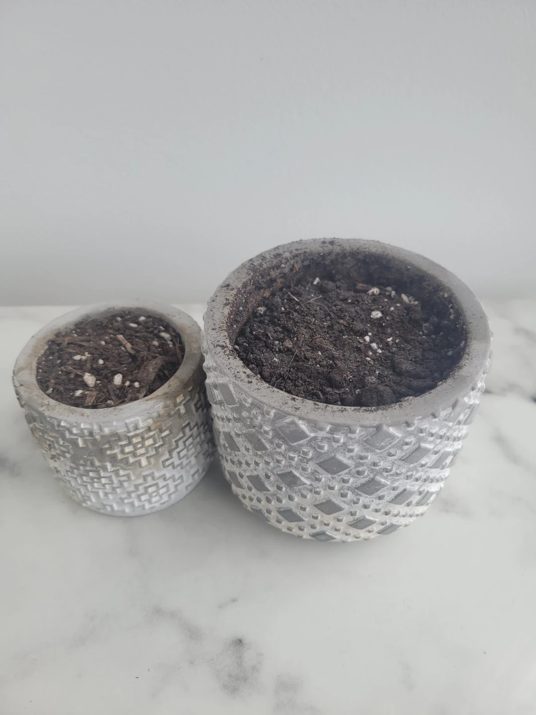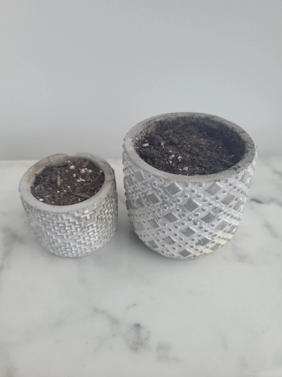 Two concrete planters with a geometric pattern. One planter is smaller than the other. They're ready for your favourite small plants!