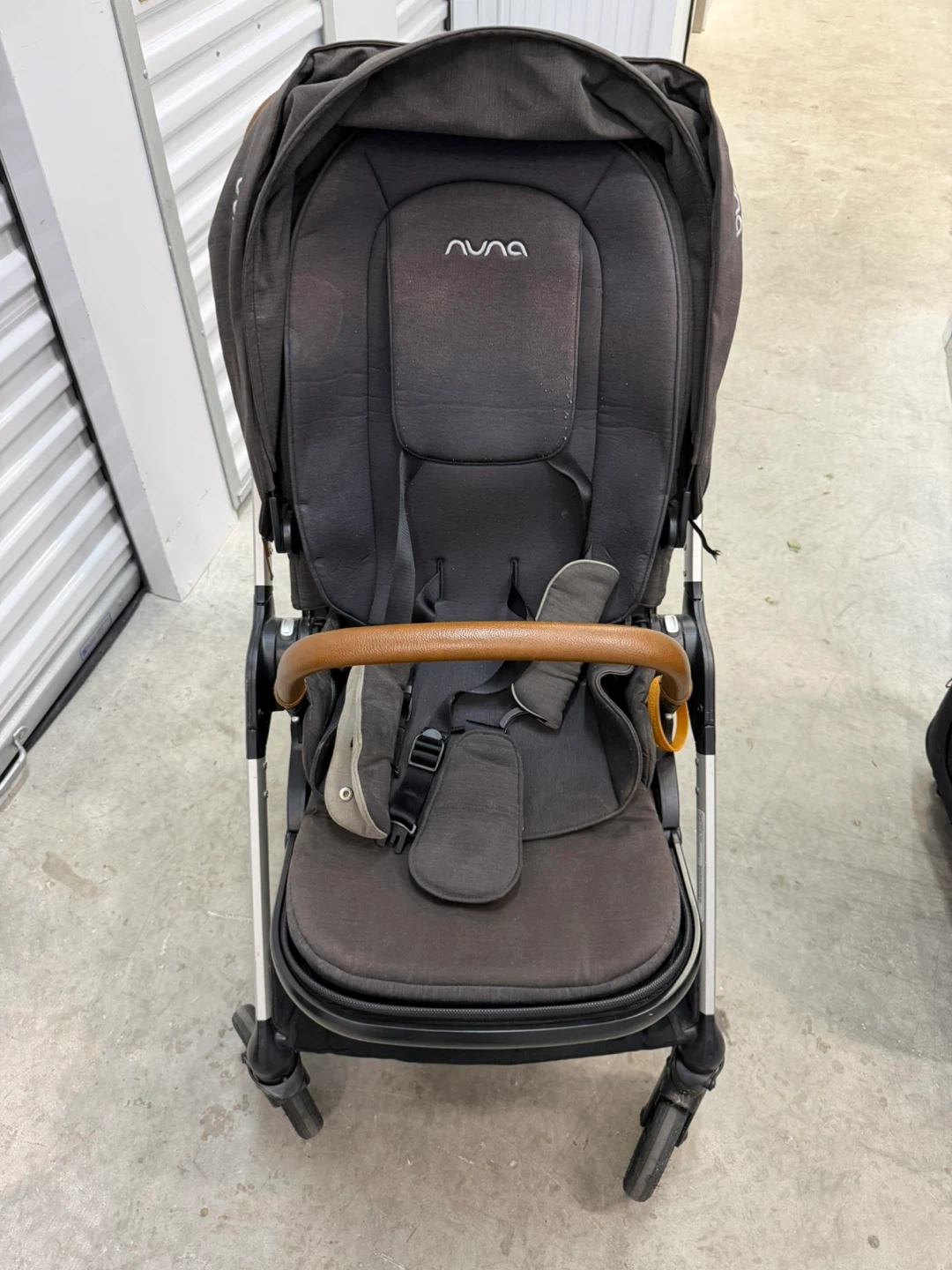 This is a Nuna stroller in a dark gray color. It has a faux leather handle and a padded seat with a 5-point harness. It's suitable for travel.