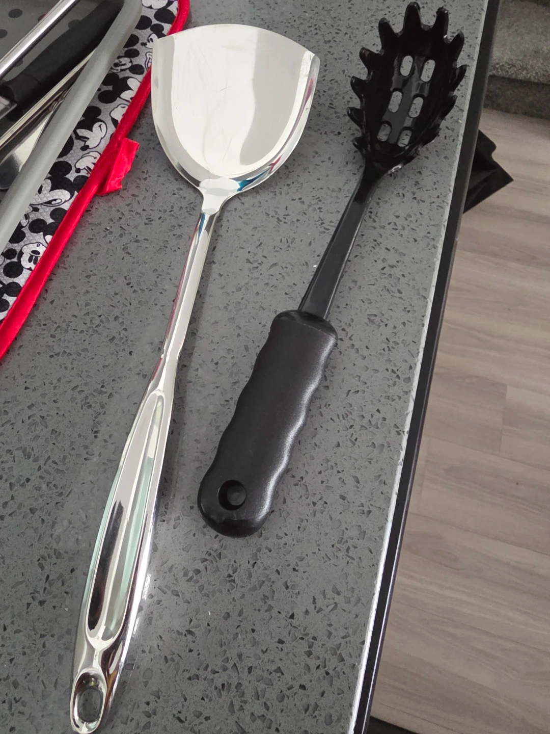 Set includes a shiny metal wok spatula and a black spaghetti serving spoon. These kitchen tools are essential for stir-frying and serving pasta. They're durable and easy to clean!