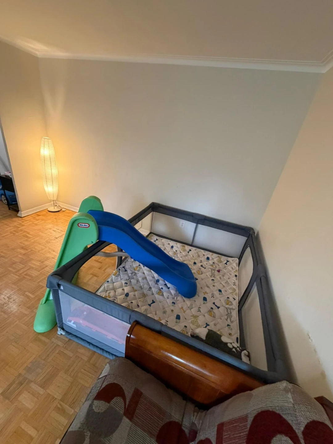This Little Tikes set includes a junior play slide and a playpen. The slide is green and blue, and the playpen is grey with a patterned mat inside. It's great for keeping little ones entertained and safe indoors!