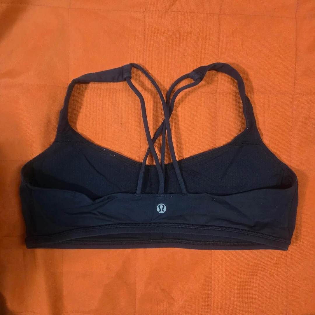 This is a Lululemon sports bra. Size small. It's black and features a strappy back design. Material is soft and stretchy.