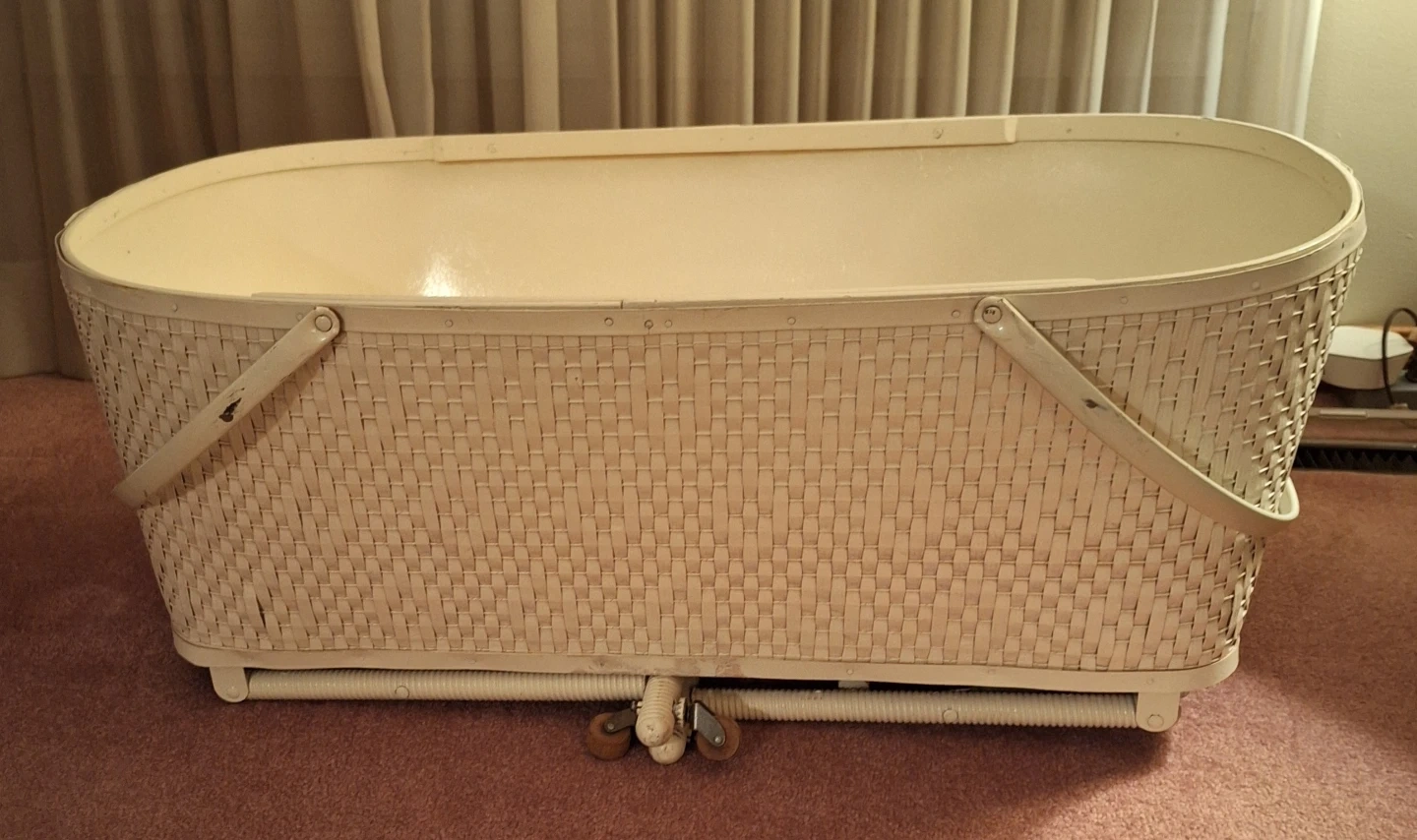 Baby Bassinet with folding wooden legs and wooden wheels.