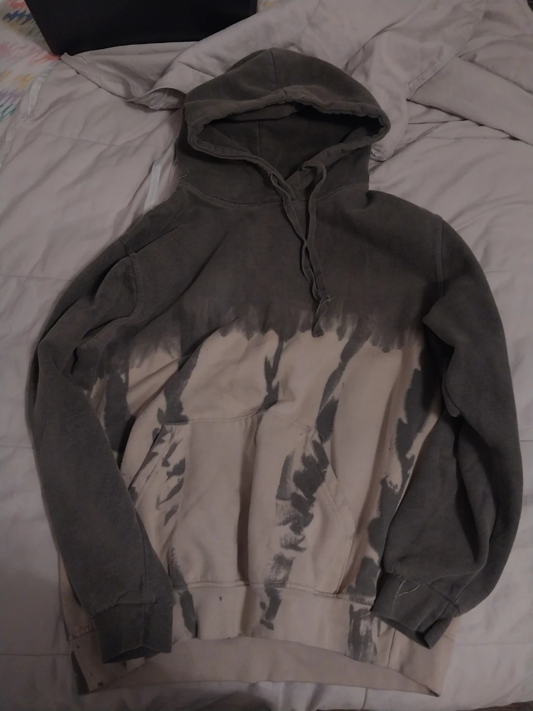 This Ed Hardy hoodie features a tie-dye wash and a prominent skull and roses graphic on the back. It's a comfortable, long-sleeved hooded sweatshirt with a front kangaroo pocket. Great for casual wear!