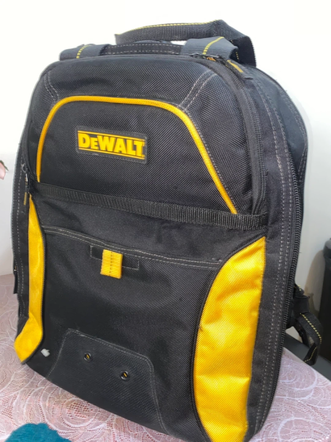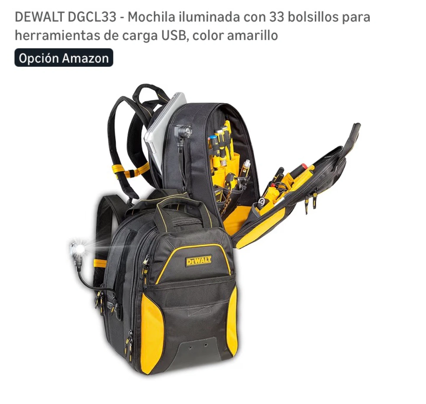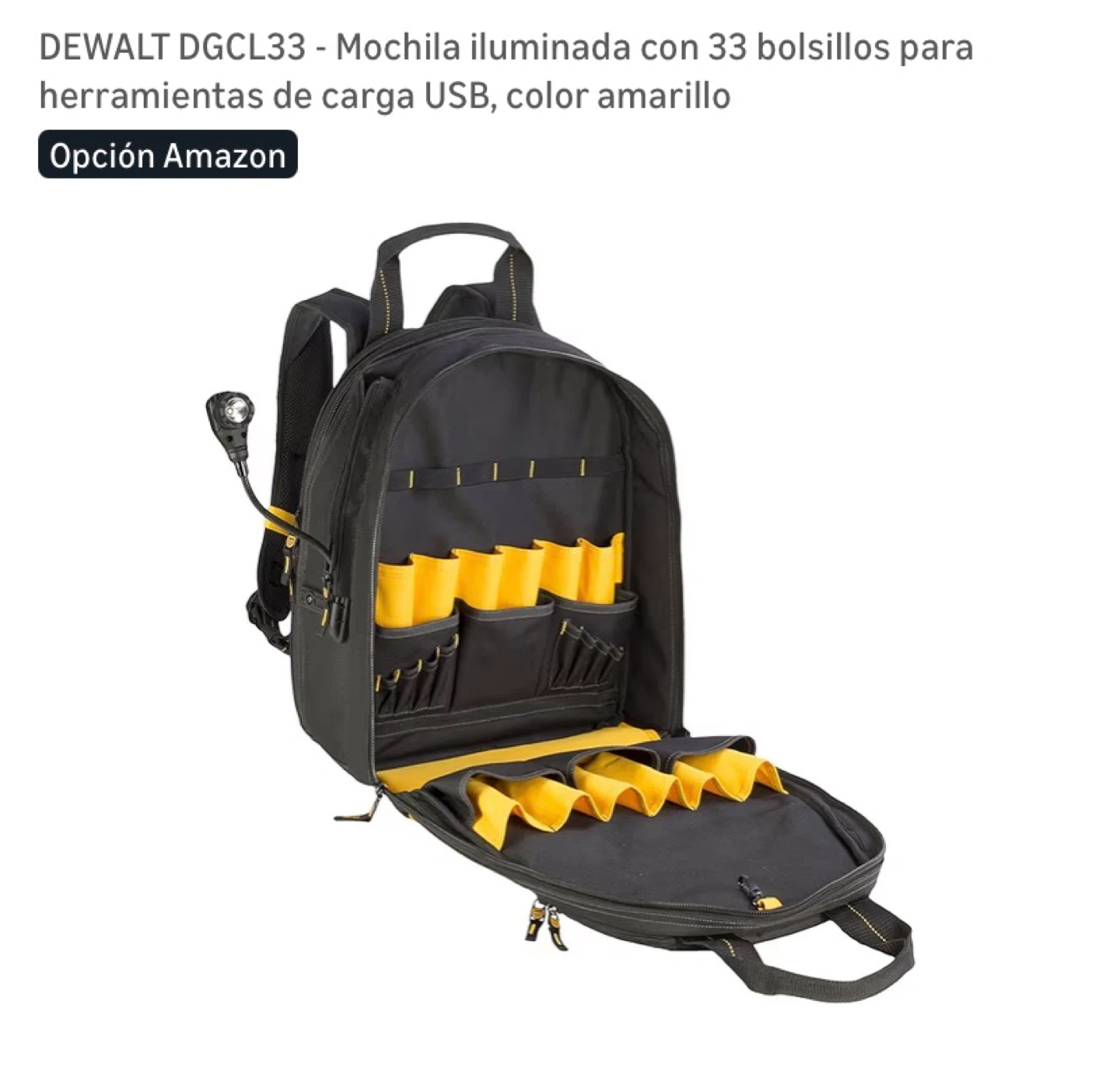 This is a DEWALT DGCL33 tool backpack. It's black and yellow with 33 pockets. Features USB charging and an integrated LED light.