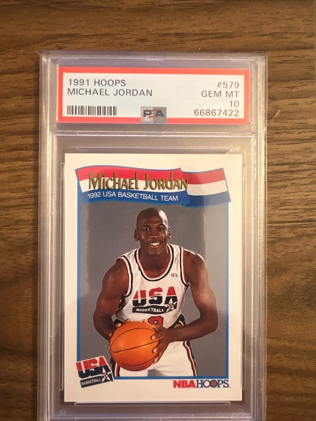 Buy & Sell1991 Hoops Michael Jordan #579 PSA 10 Gem Mint Card1991 Hoops Michael Jordan #579 PSA 10 Gem Mint Card$350This is a 1991 Hoops Michael Jordan card, graded PSA 10 Gem Mint. It features Jordan as part of the 1992 USA Basketball Team. The card number is #579.WHERE TO MEETLobbyView MapSELLERverifiedAdamWoodbine Corridor34425 reviews0 chats·1 favorites·14 viewsSEND CHAT TO SELLERHi Adam! I’m interested in your listing.Hi Adam! I’m interested in your listing.Get the Karrot app to chatSign In to chat