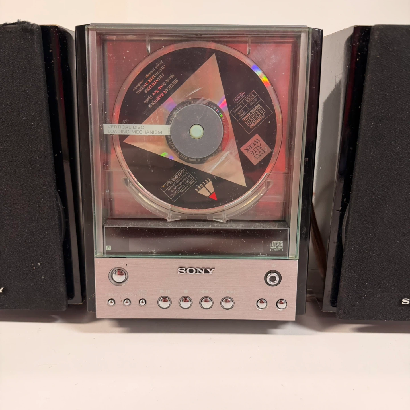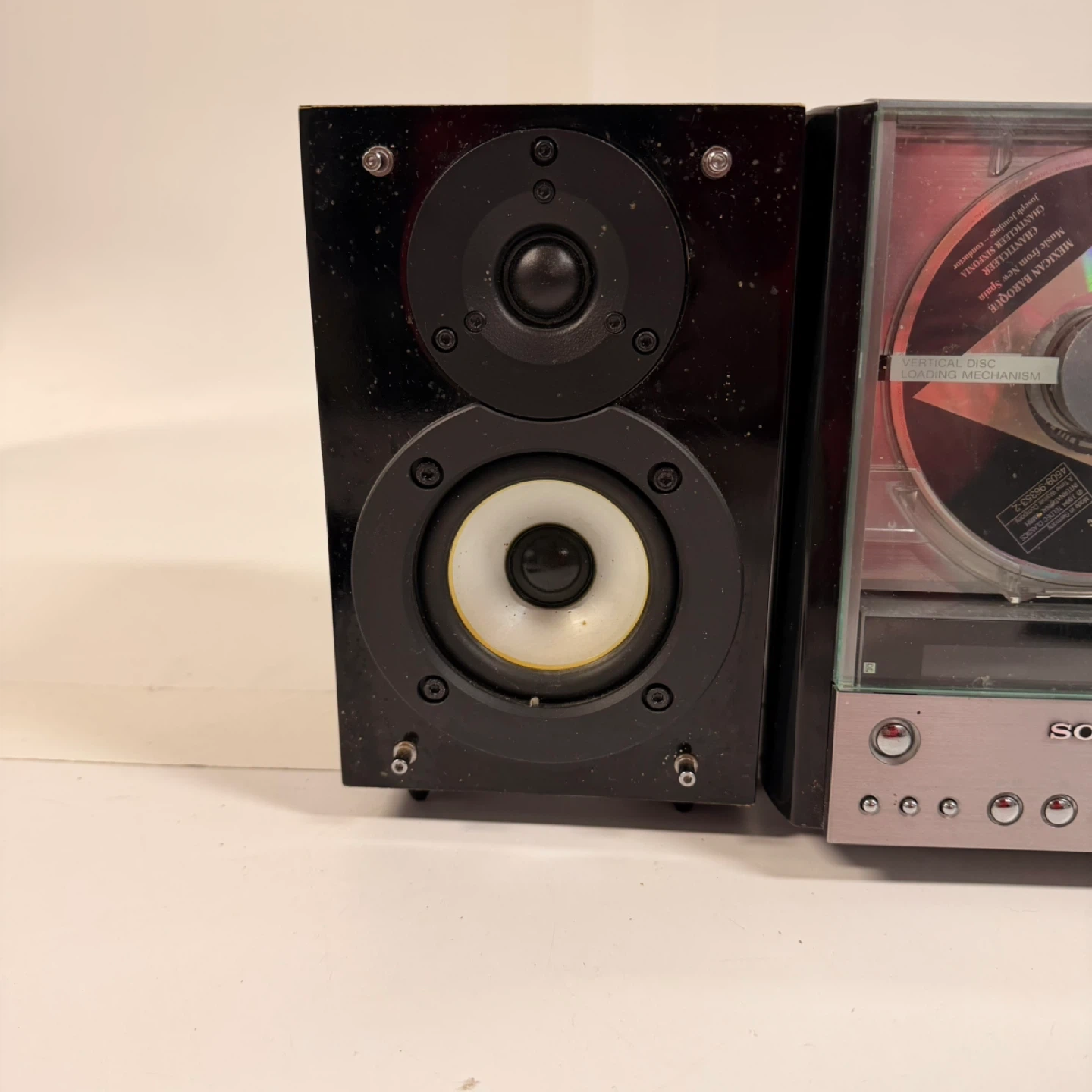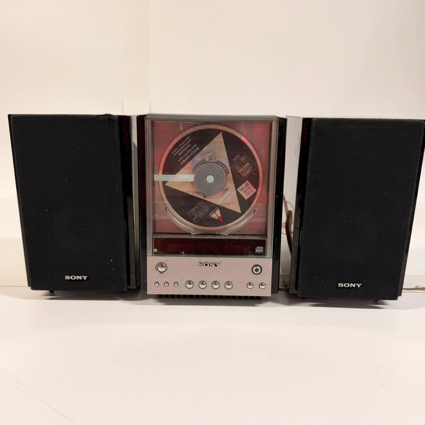 Sony compact stereo system with CD player and two speakers.