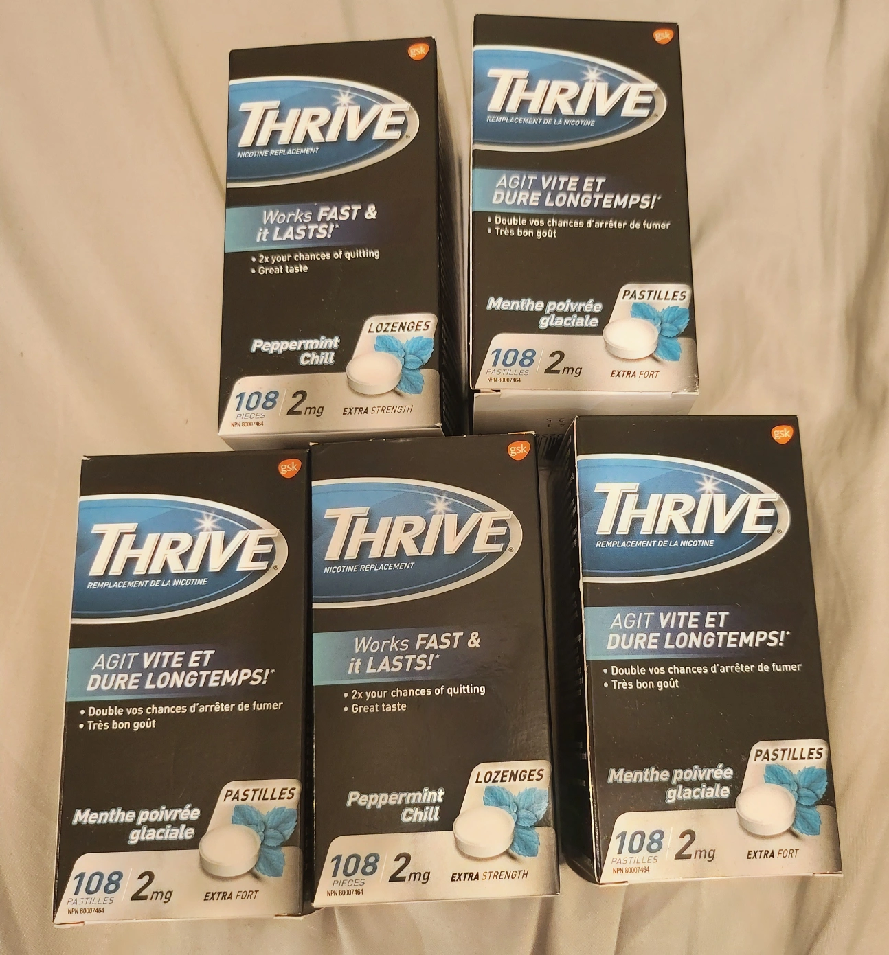 5 boxes of Thrive Nicotine Lozenges. Each box contains 108 pieces and is extra strength (2mg).