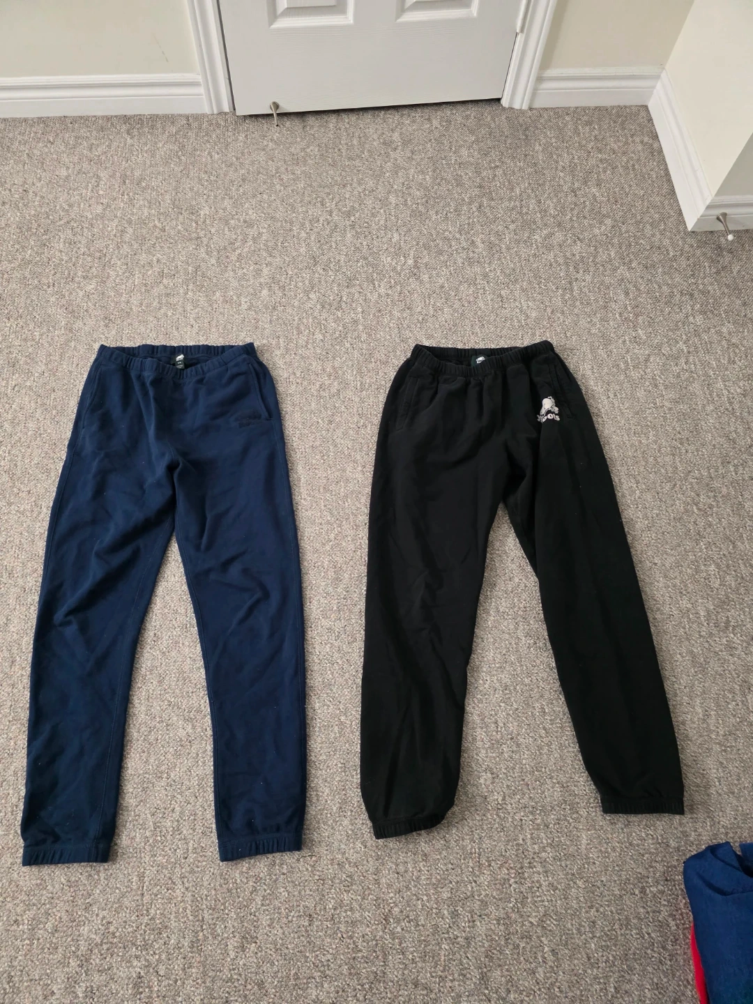 Selling two pairs of sweatpants. One pair is navy blue and the other is black. Both are in good condition and ready for a new owner!