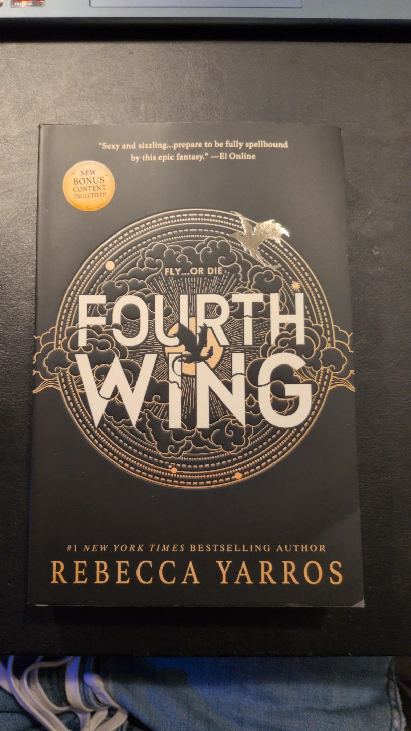 This is "Fourth Wing" by Rebecca Yarros, a #1 New York Times bestselling fantasy novel. It's an epic adventure about dragon riders. Includes bonus content, and originally bought at $27.99