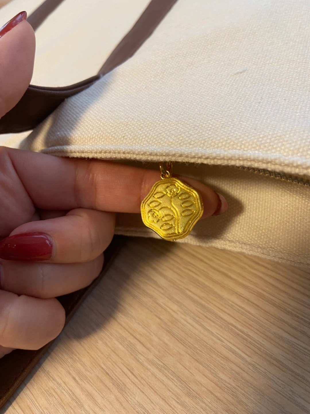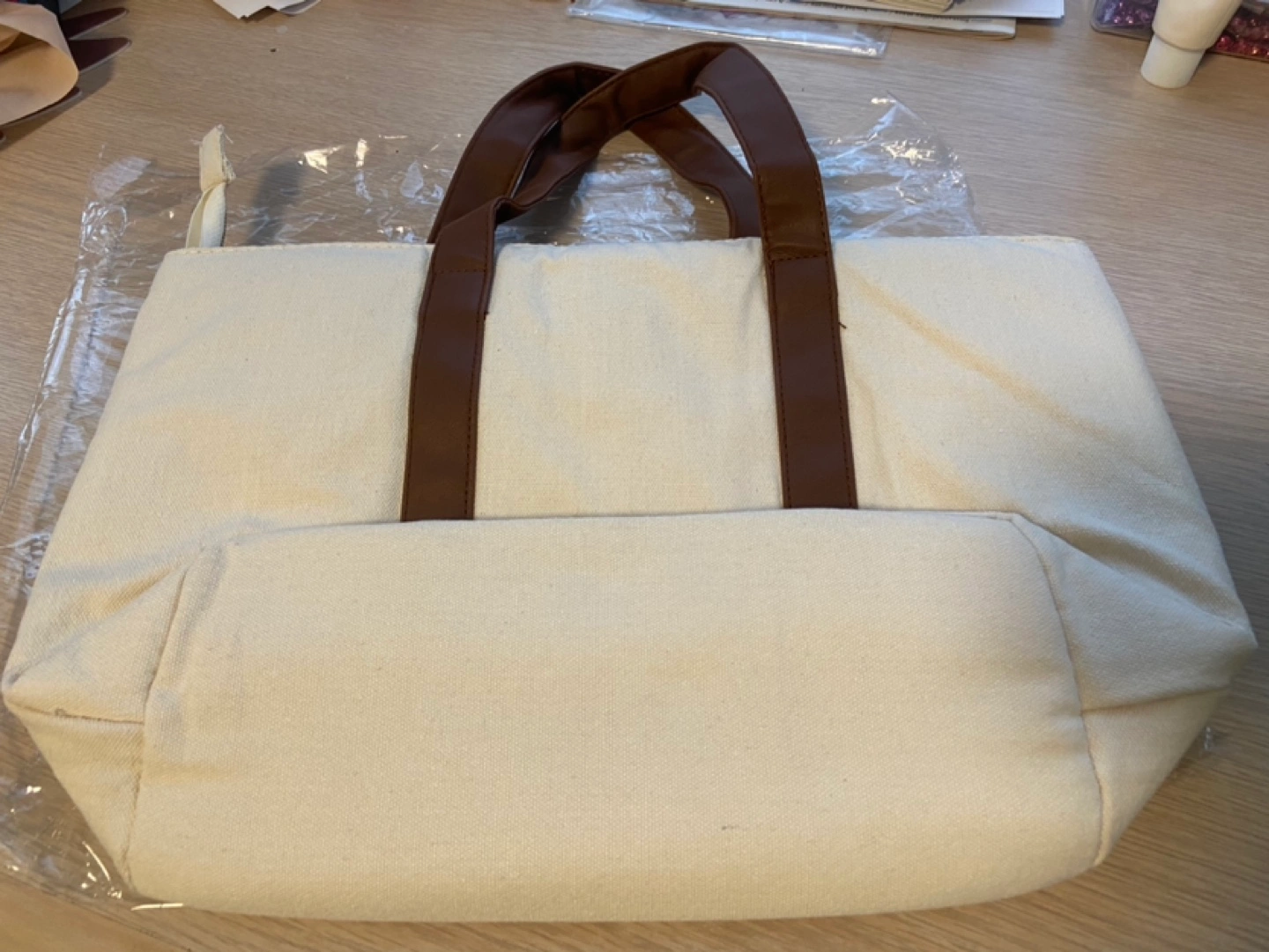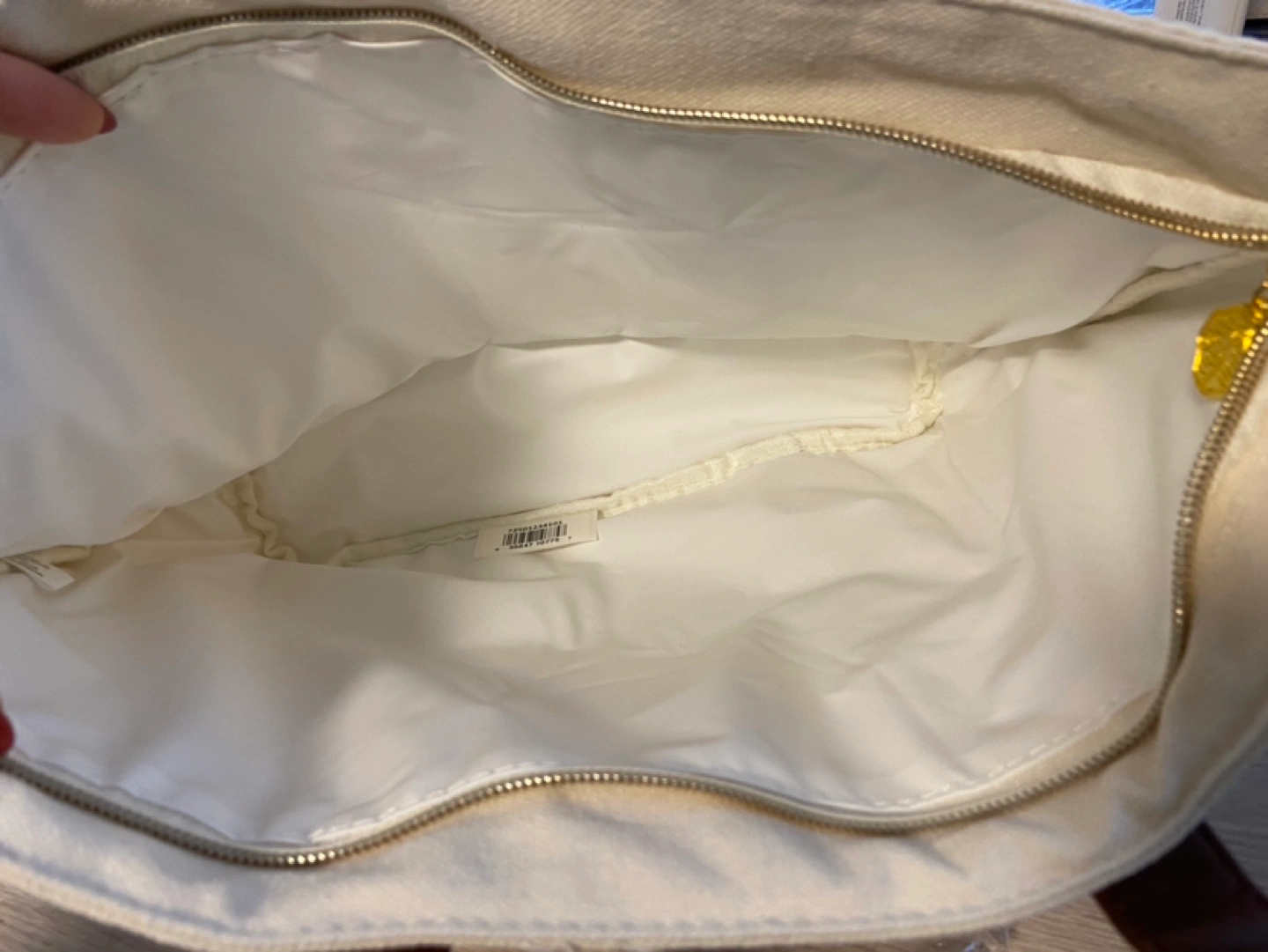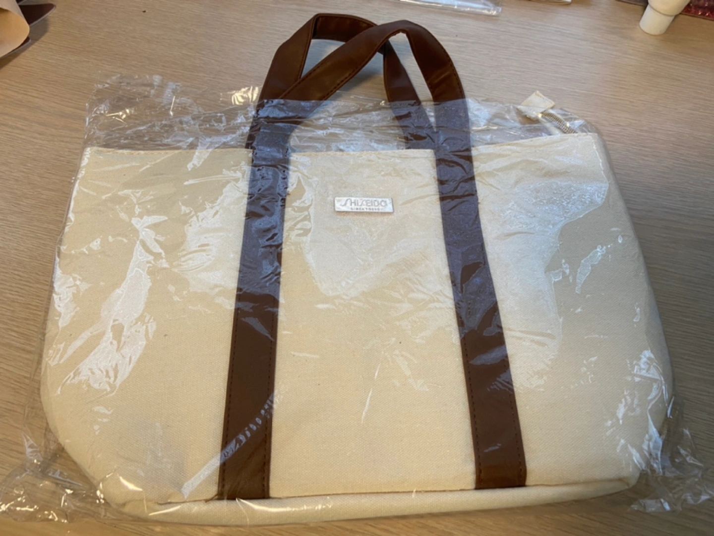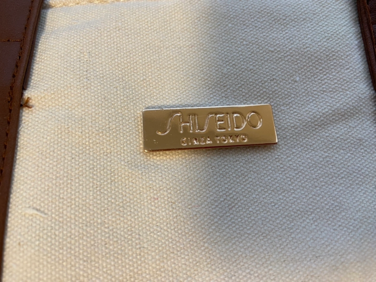 Cream coloured canvas tote bag. Brown faux leather handles and accents. Gold Shiseido logo. Zipper closure. Interior zip pocket. New with tags.