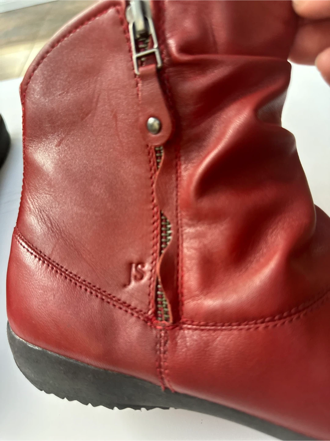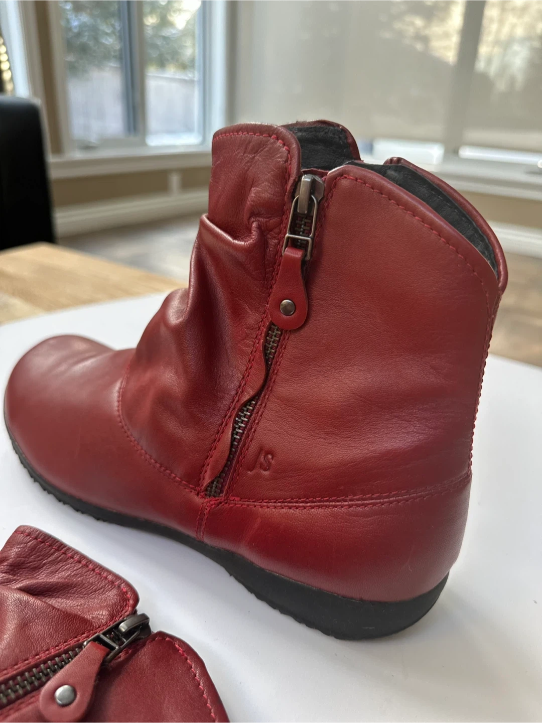 JOSEF SEIBEL ‘Naly 24’ red leather ankle boots with side zippers. These boots have a soft, flexible design and a low heel for all-day wear.