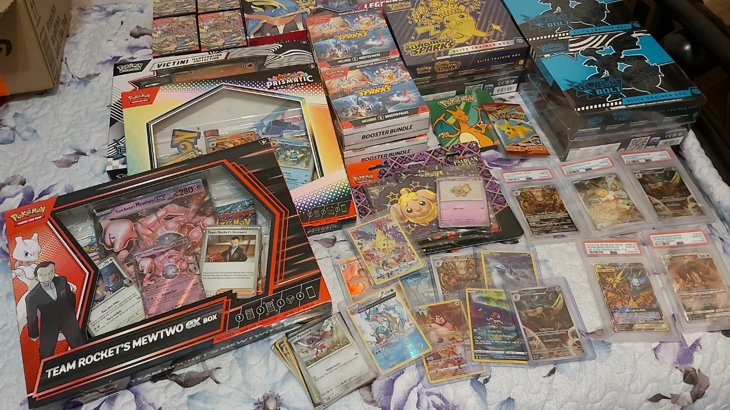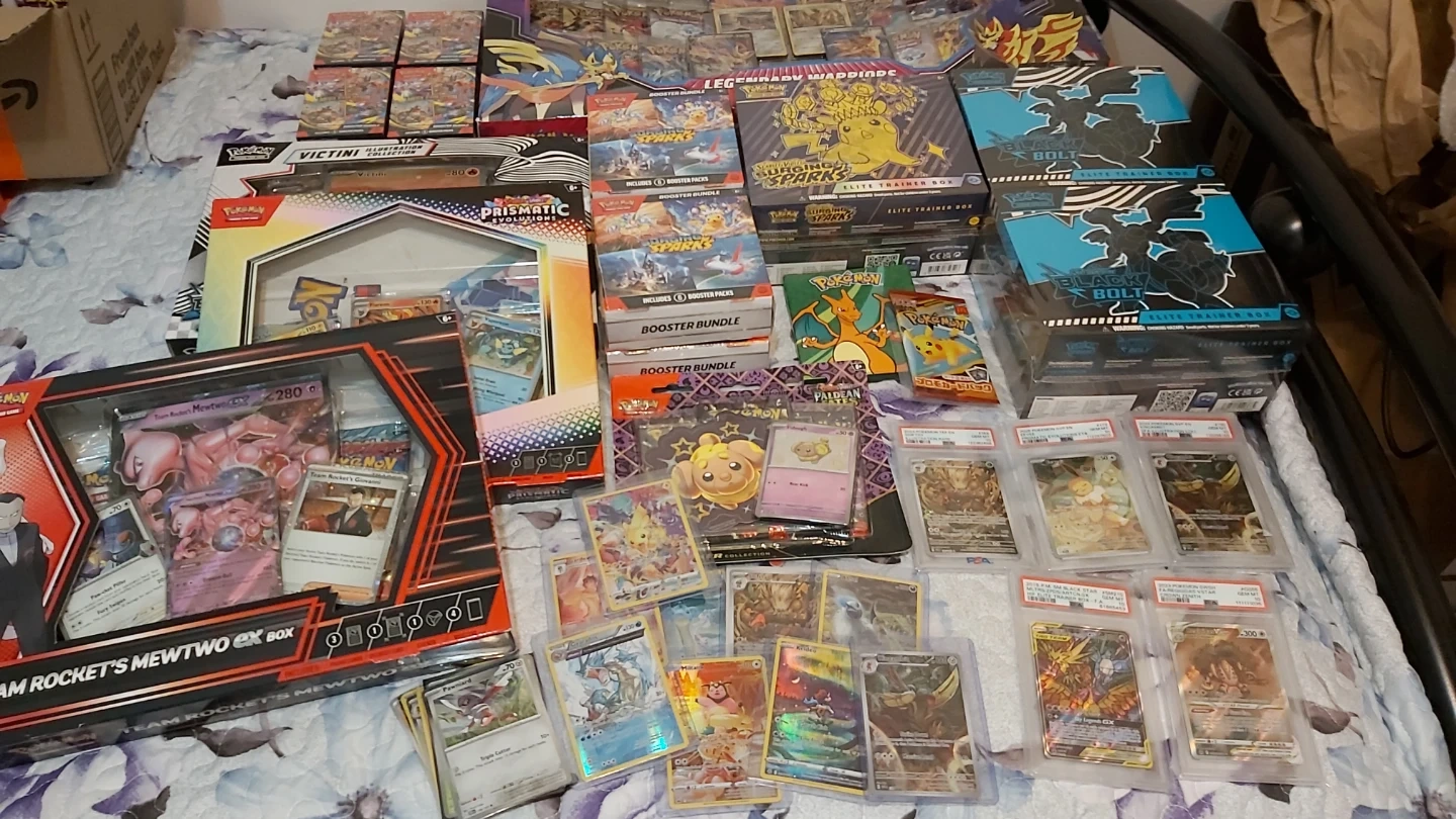 $2000 is the price for everything pictured. Legendary Warriors, sealed items. PSA 10 Moltres, Shiftry, Kingambit, Regigigas Cards, Mega Boosters Mewtwo Box, Booster Bundles, Victini Collection, McDonald's Pikachu