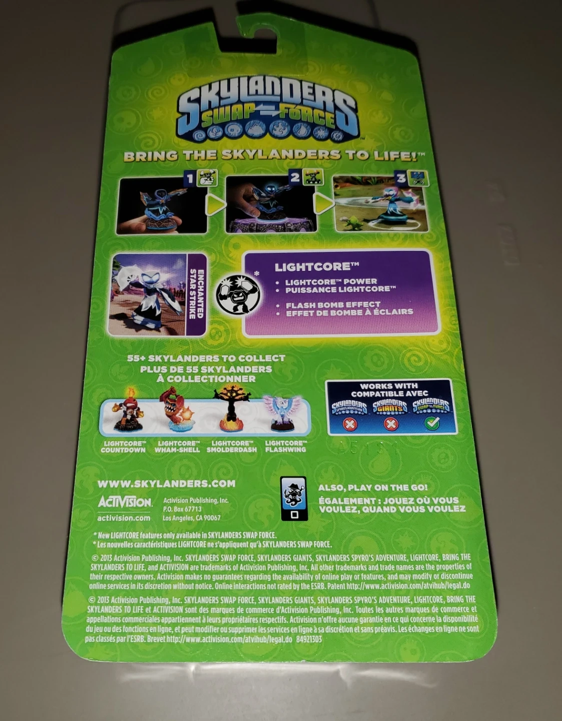 This is a Skylanders Swap Force Lightcore Enchanted Star Strike figure. It's a Lightcore Power figure with a flash bomb effect! Includes 1 Skylanders figure, and 1 trading card. Recommended for ages 6+.