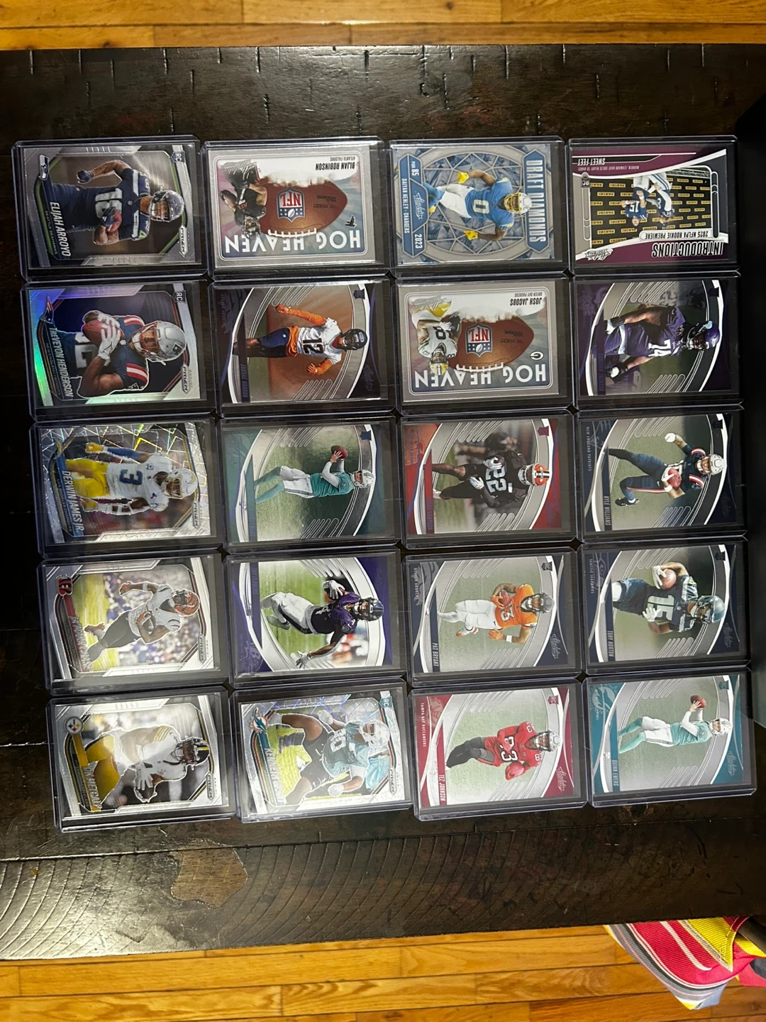This lot includes 24 NFL football trading cards. Some cards feature players like Elijah Arroyo, Bijan Robinson, and Josh Jacobs. Various card sets are present, including "Hog Heaven" and "Introductions".