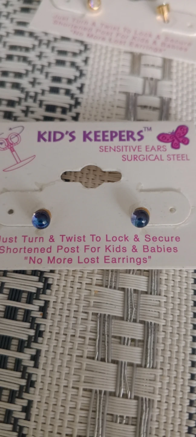 Kid's Keepers earrings for sensitive ears. They're made with surgical steel for comfort and durability. The shortened post is designed to lock and secure, preventing lost earrings for kids and babies.