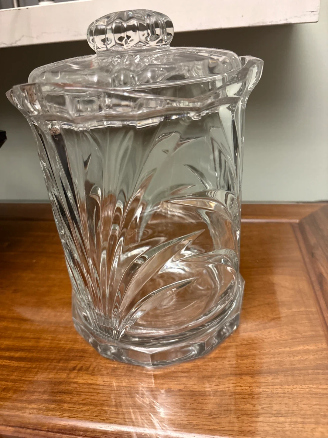 Selling a lovely crystal container with a lid. It's in great condition and has a beautiful design. Perfect for adding a touch of elegance to your home!
