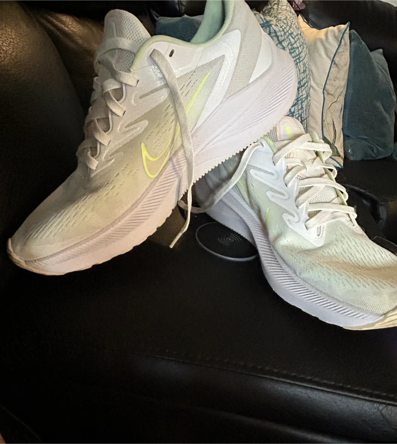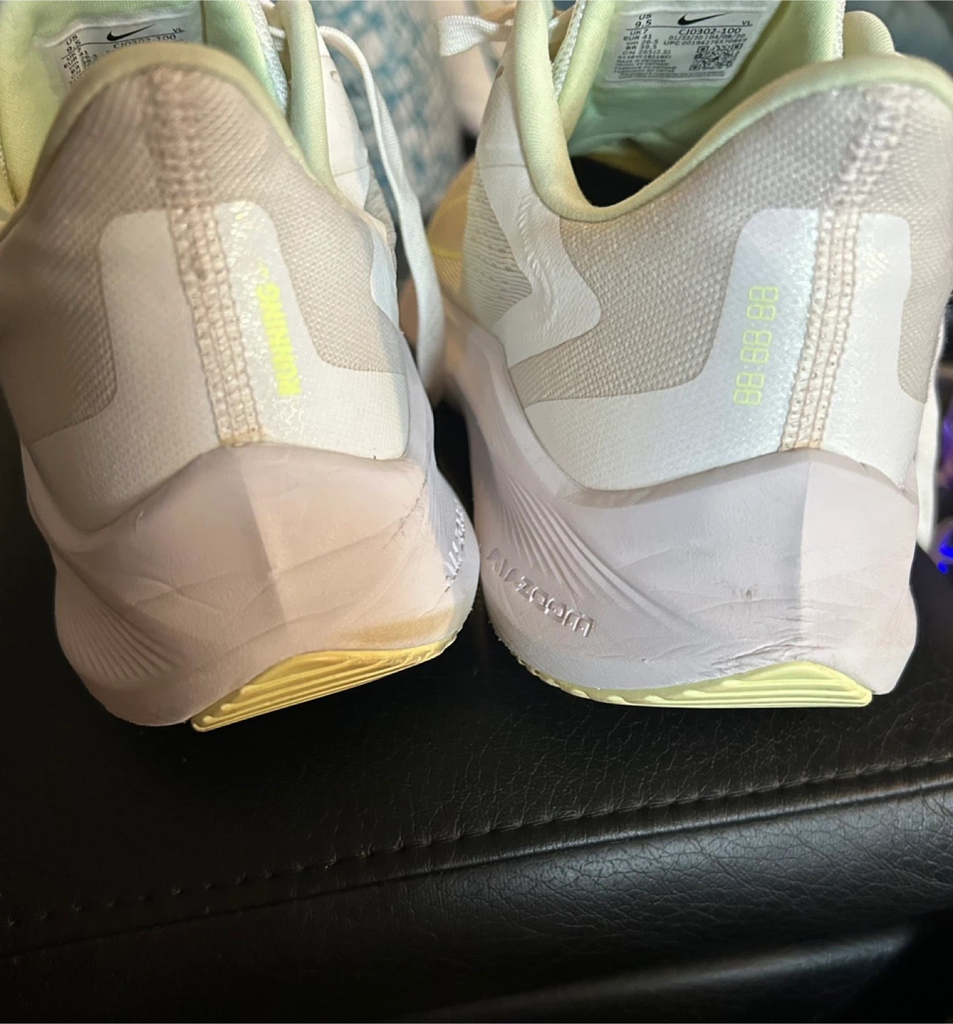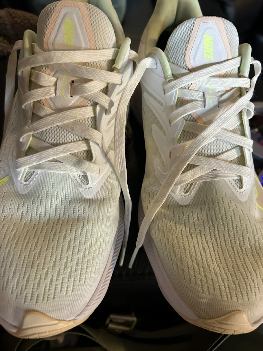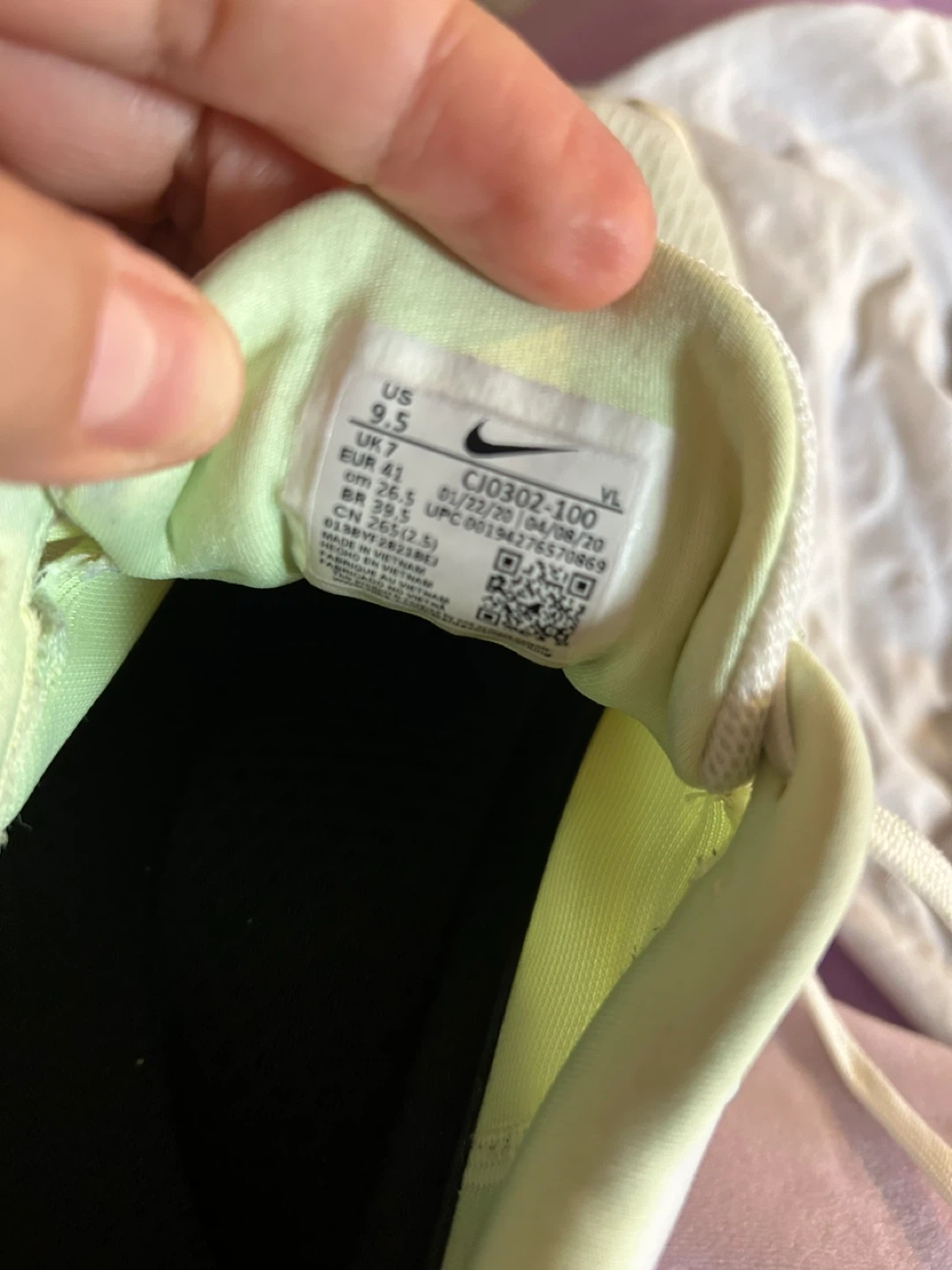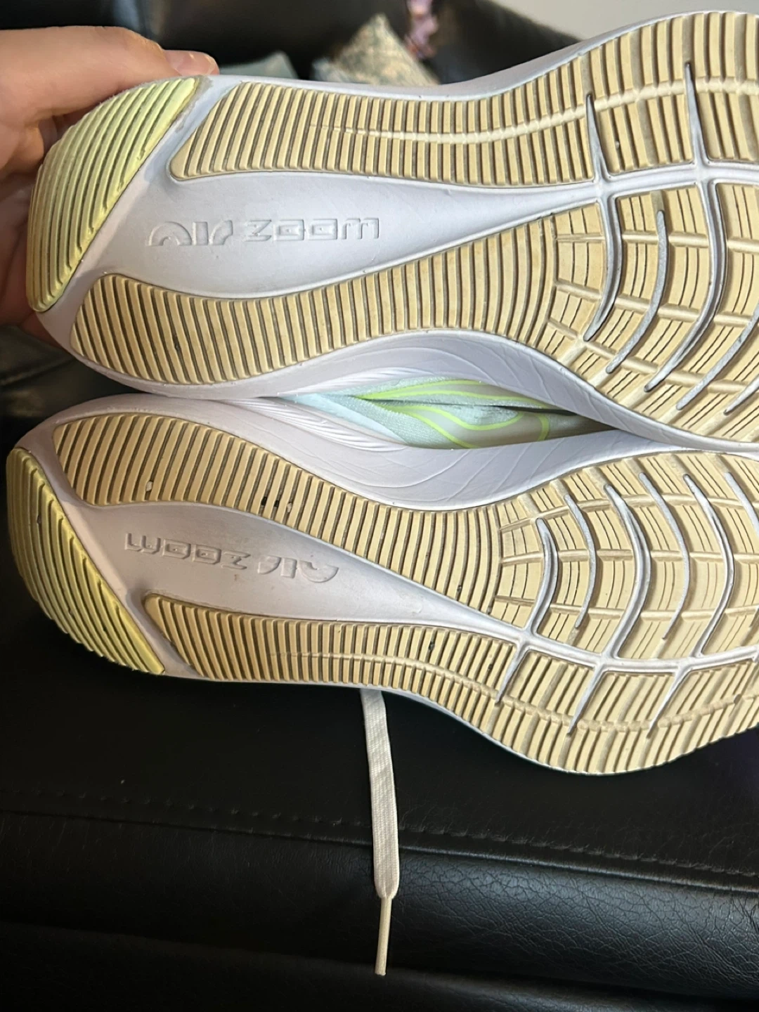 These Nike Air Zoom running shoes are designed for comfort and performance. They feature a breathable mesh upper and a responsive cushioning system. The shoes are a light pastel green with yellow and pink accents. Suitable for road running or everyday wear. open to reasonable offers. I invite you to view my other items; if you are interested in any of them, I will give you a better price.