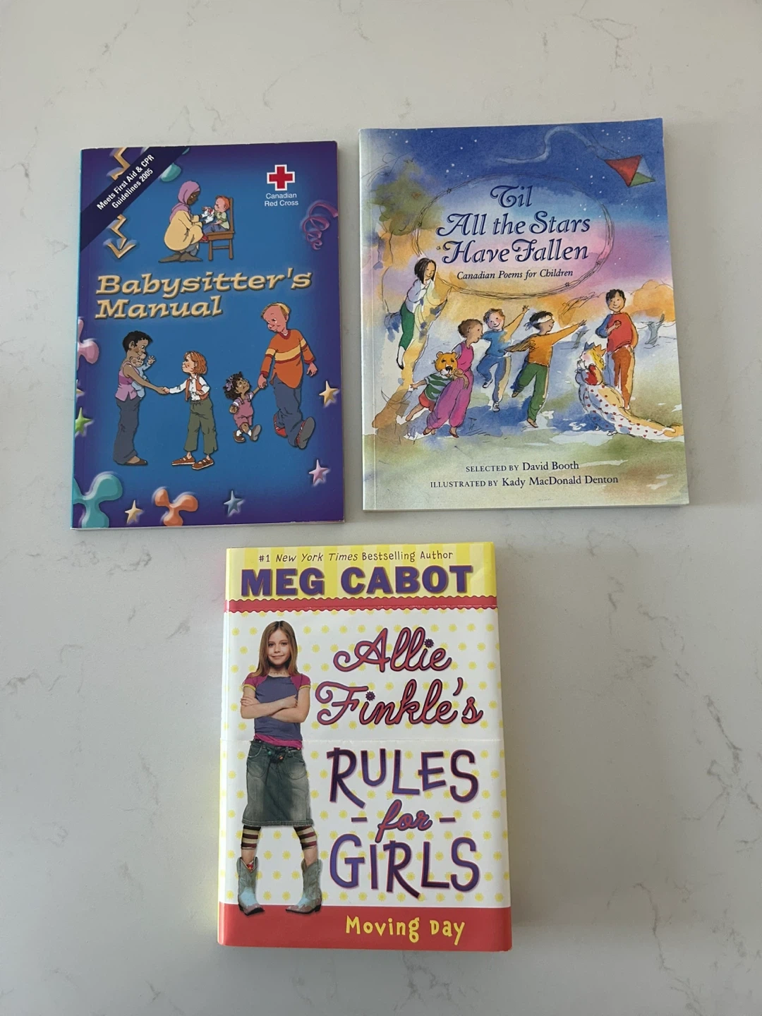 Explore a collection of engaging children's books, including the 'Babysitter's Manual' for aspiring babysitters , 'Til All the Stars Have Fallen' featuring delightful Canadian poems, and 'Allie Finkle's Rules for Girls: Moving Day'. All books are in great condition, perfect for young readers.