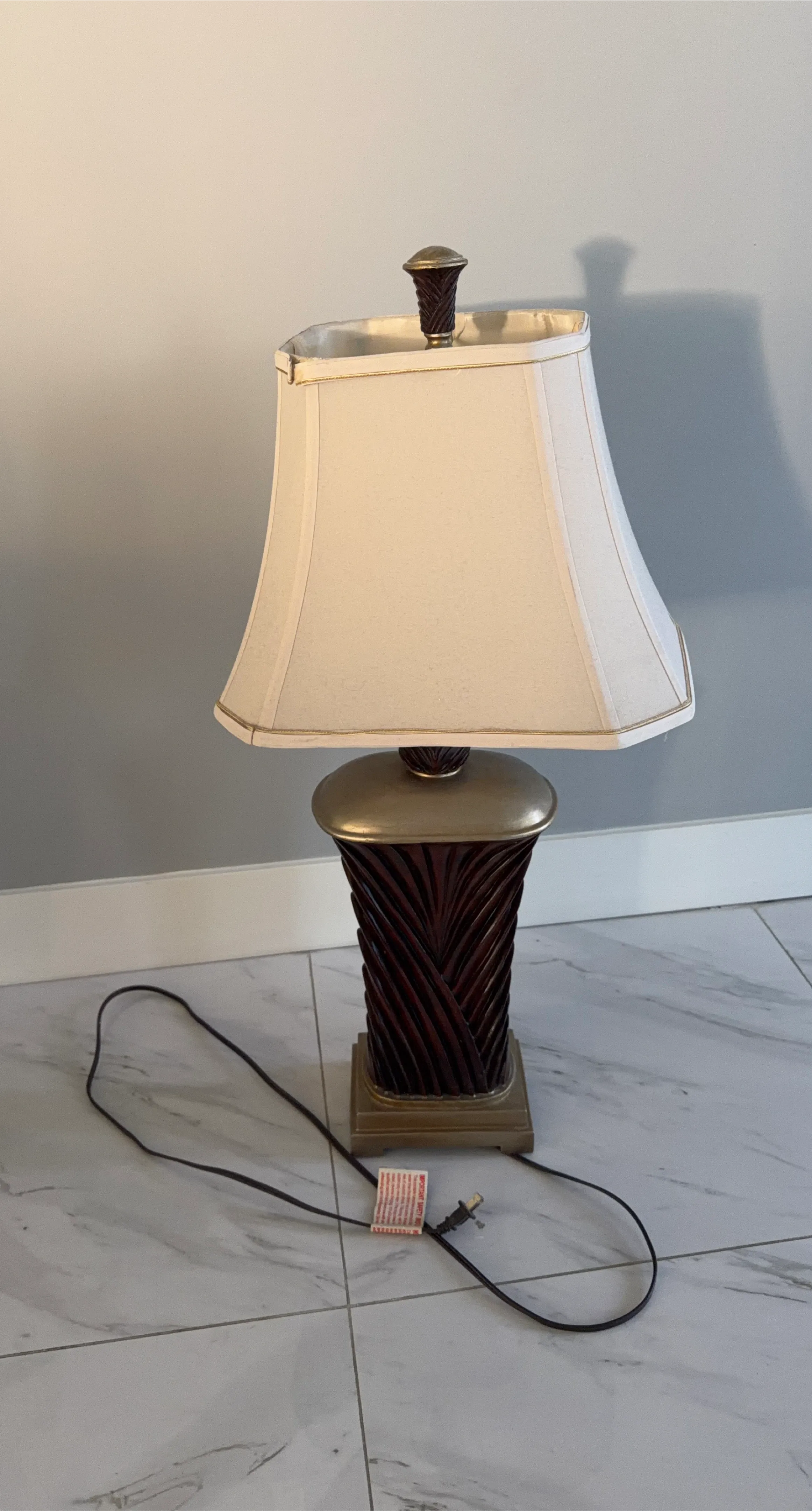 This decorative table lamp features a unique carved wood base in a rich dark finish with gold accents. It has a cream-coloured fabric lampshade with gold trim. The lamp's base is about 16 inches tall.