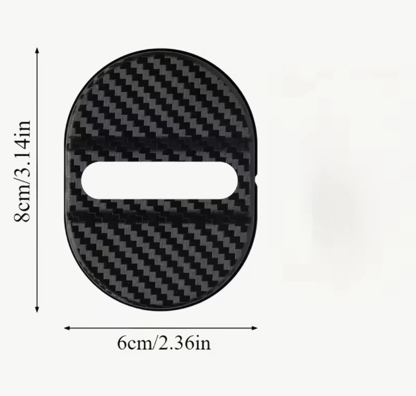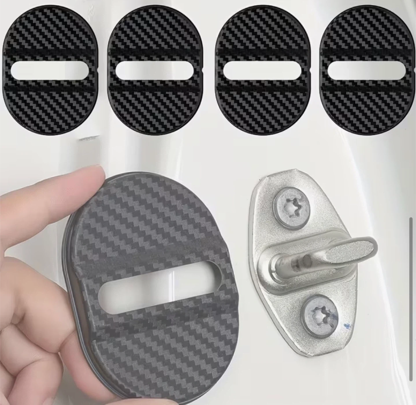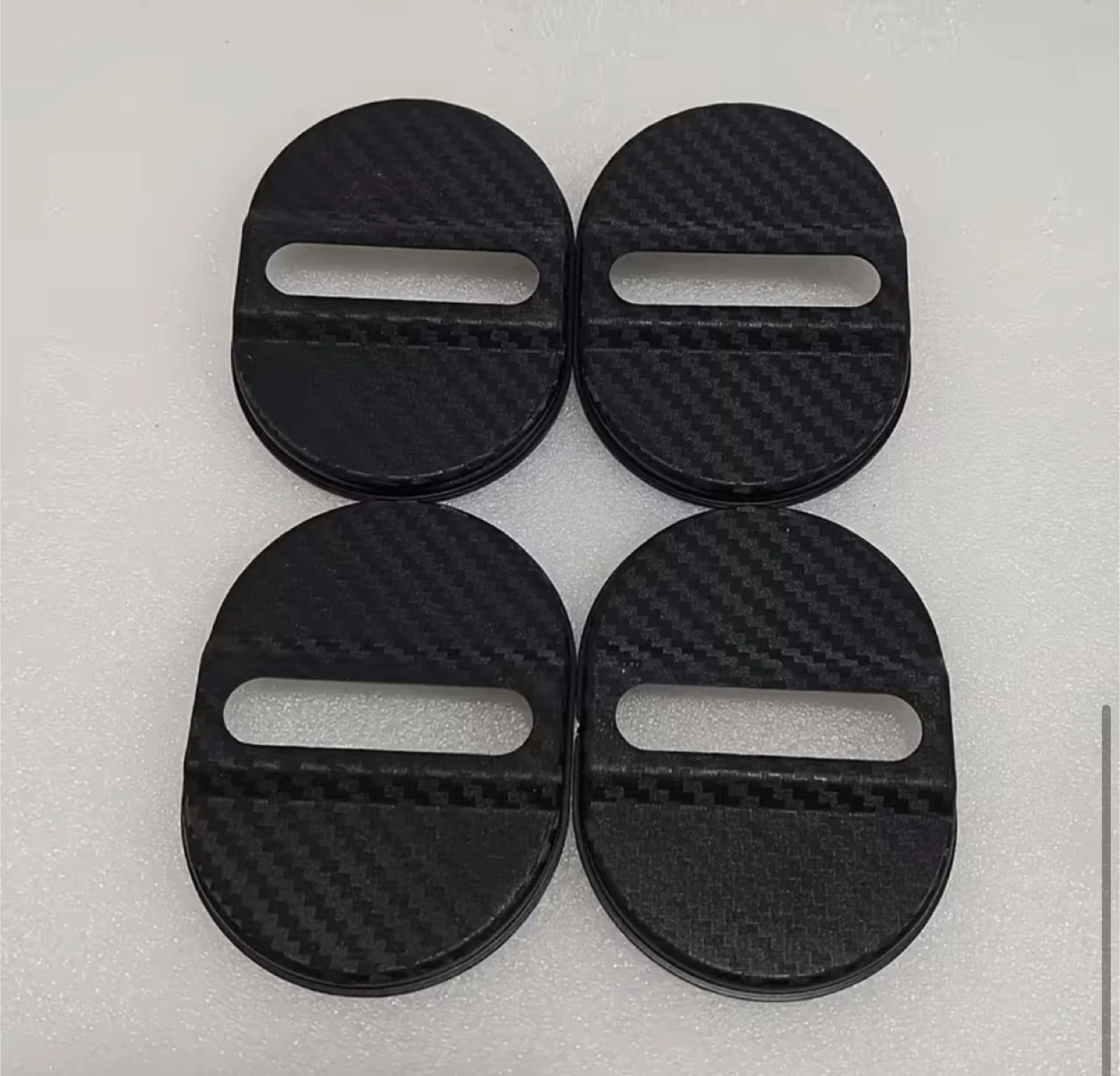 Set of 4 carbon fiber style door lock latch covers. These are designed to fit over your car's door lock latches for a stylish upgrade. They have a carbon fiber pattern and measure 8cm by 6cm. This is a great way to add a custom touch to your vehicle's interior.
