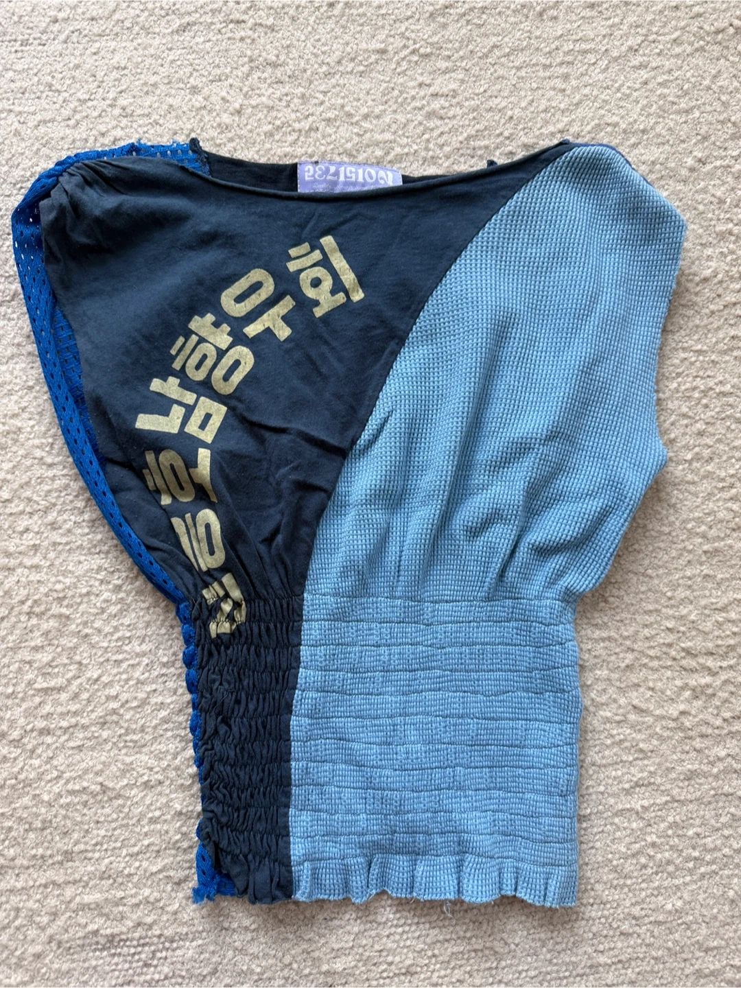 A unique, patchwork top featuring mesh panels and "TWO BAD" text. The fabric is stretchy with smocked detailing at the waist.