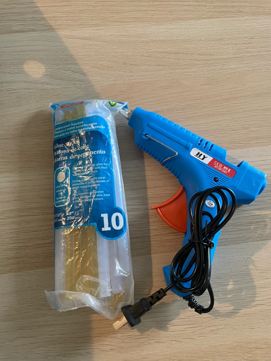 34Selling a blue HY glue gun. It comes with a pack of glue sticks, each measuring 7/16" x 8" (11 mm x 200 mm). Great for various crafting projects!