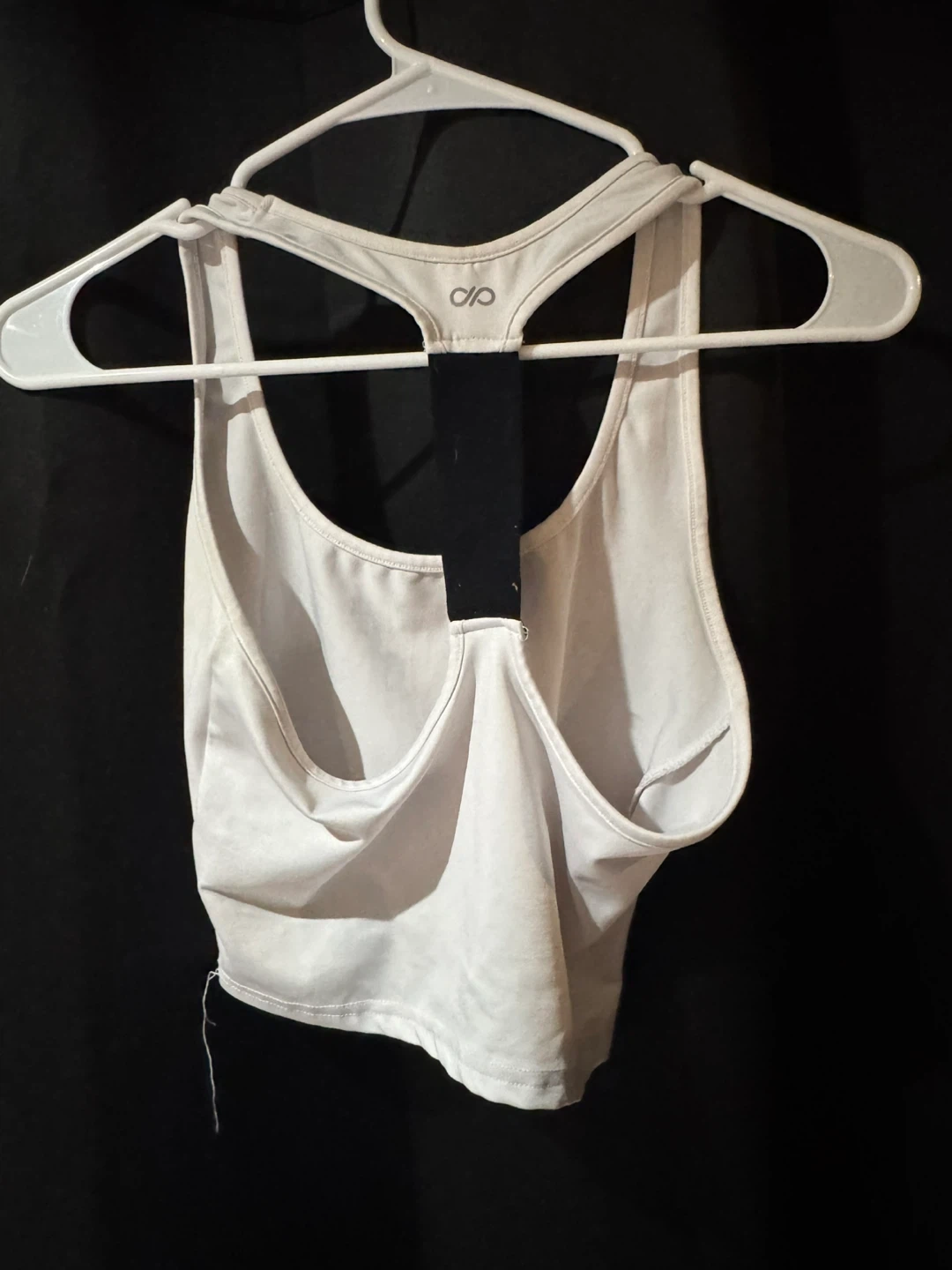 White athletic tank top with "BE STRONG" graphic. Racerback design for comfortable movement. Polyester/spandex blend.