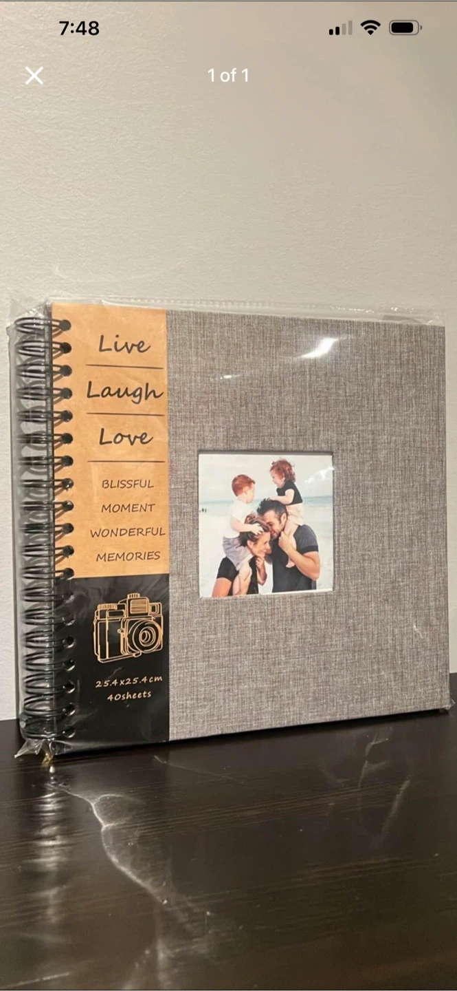 This photo album is covered in grey linen material and has a frame on the front for a personal photo. It measures 25.4 by 25.4 cm and includes 40 sheets for your memories. It's perfect for preserving cherished moments!