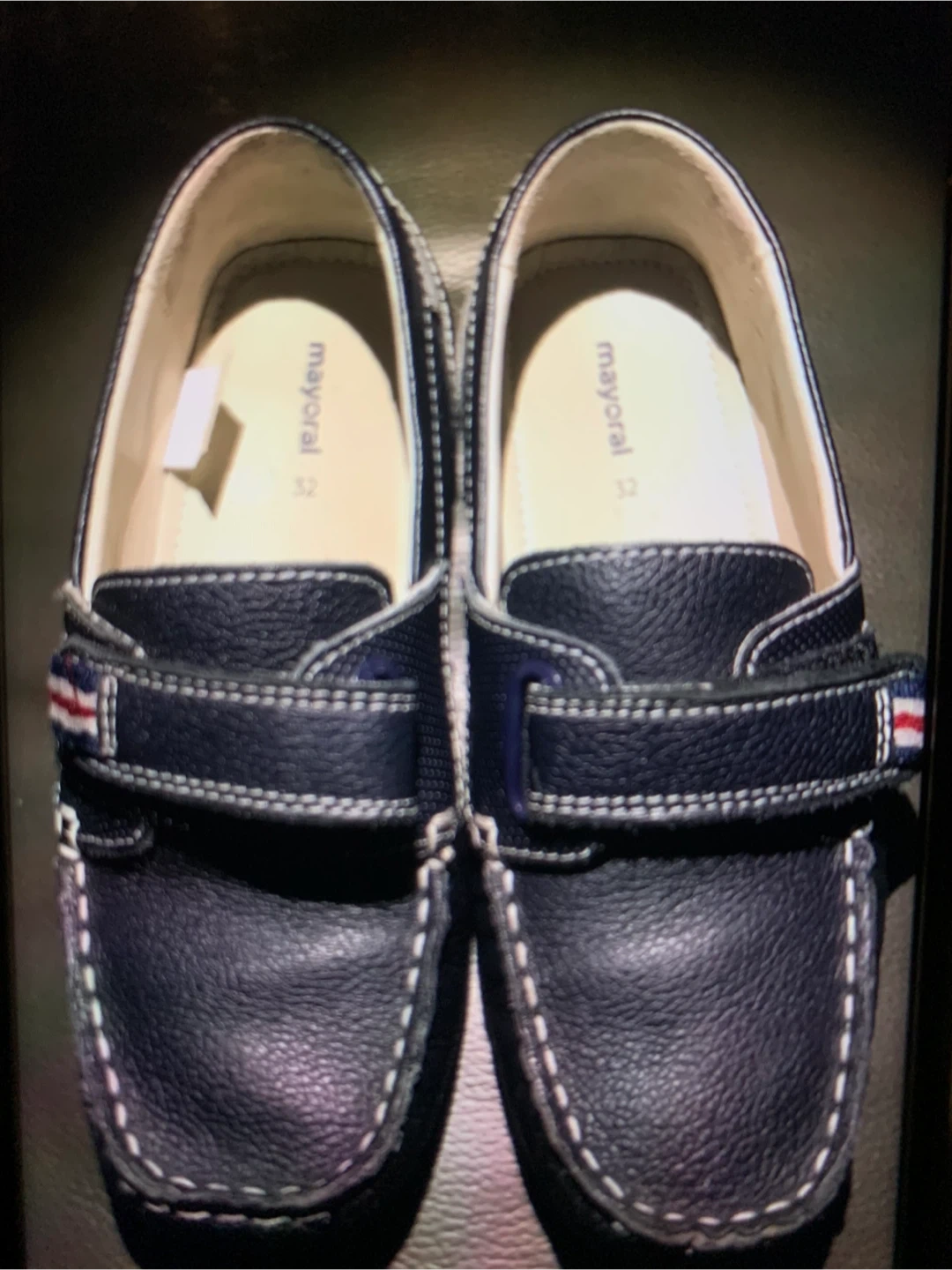 Mayoral navy blue kids loafer shoes with velcro straps for comfort.Made of real leather-inside & upper ,with white stitching detail. Size 32.