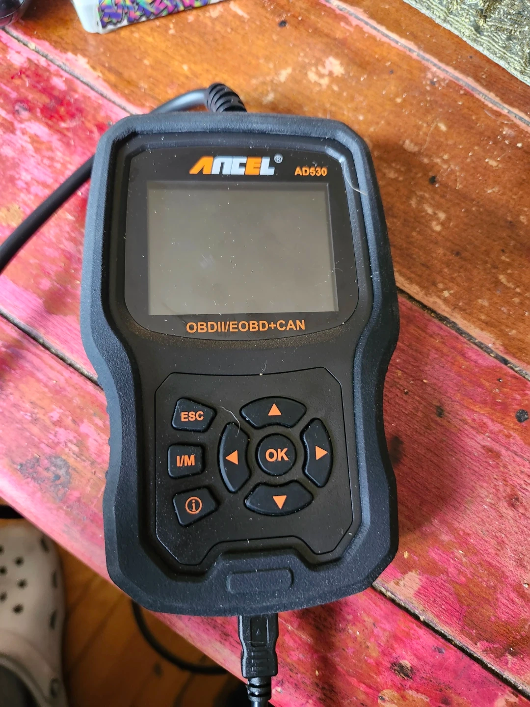 This is an ANCEL AD530 diagnostic scan tool. It supports OBDII/EOBD+CAN protocols. It has buttons for ESC, I/M, Info, and directional controls with an OK button.