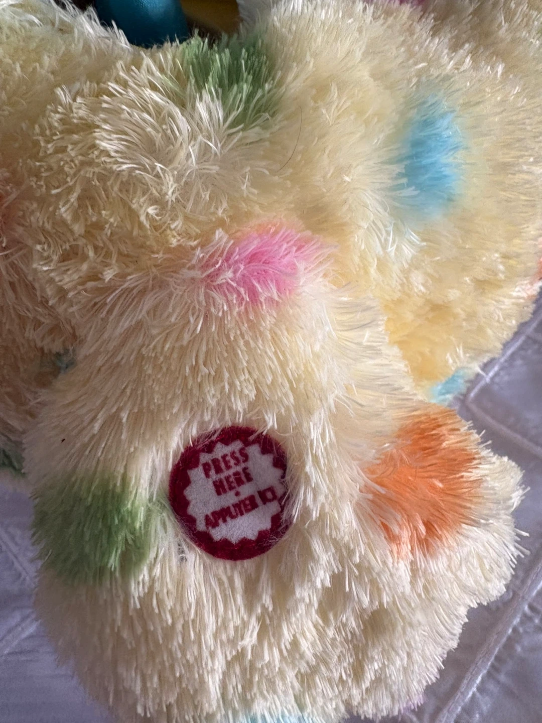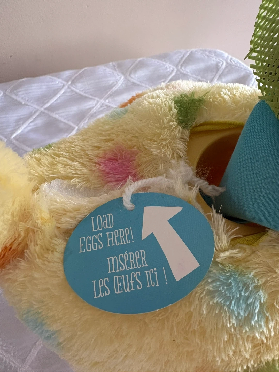 Like new fun plush yellow chick/ hen toy has a 'Press Here' button that likely activates a sound or movement. Comes with 3 eggs