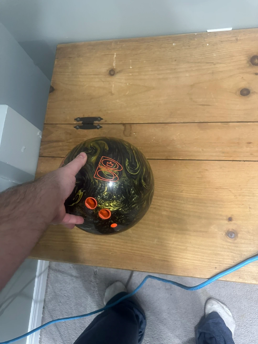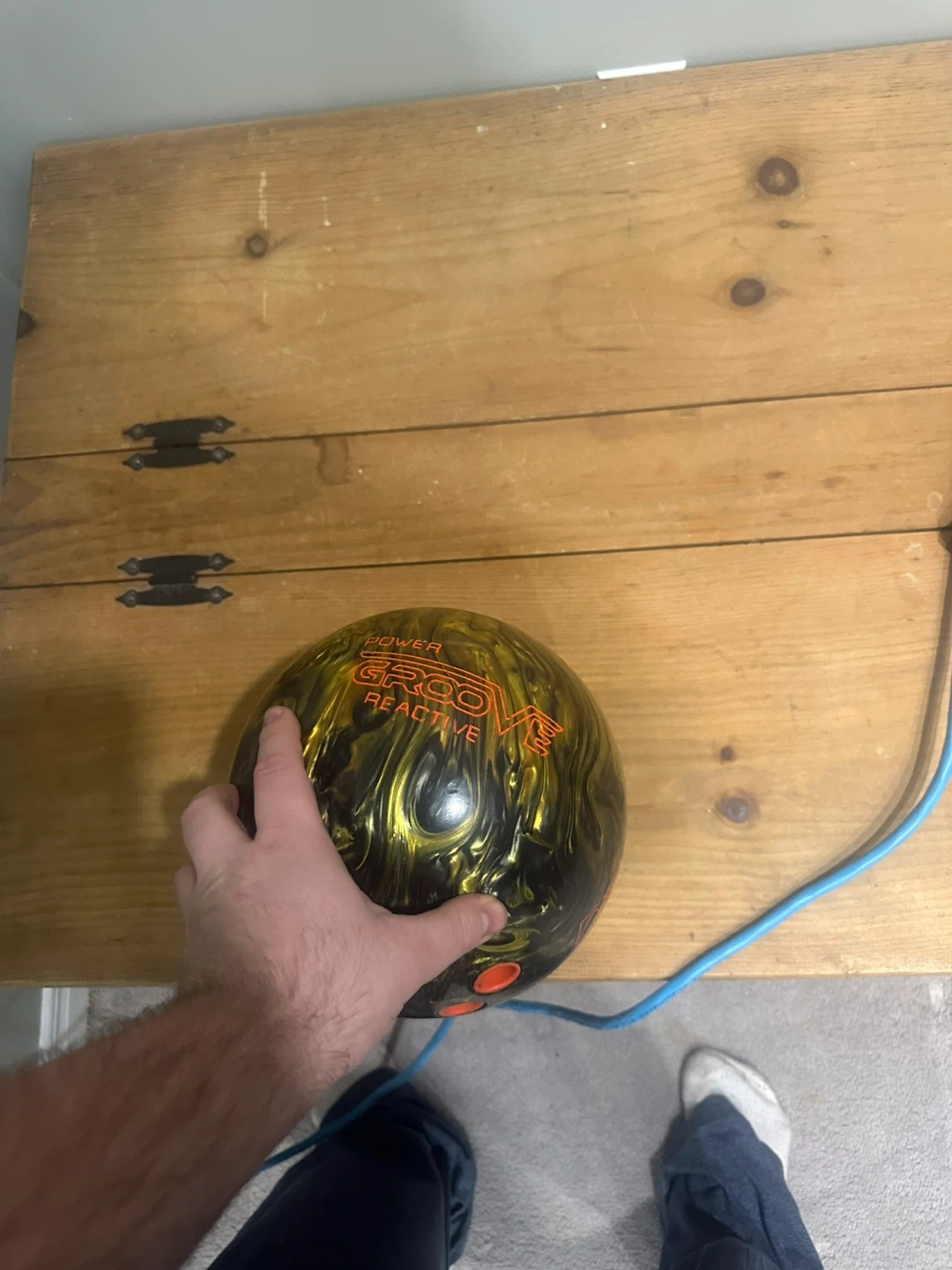 This is a Storm Power Groove bowling ball. It's a reactive ball with a black and yellow swirl design. It has three finger holes for a standard grip.
