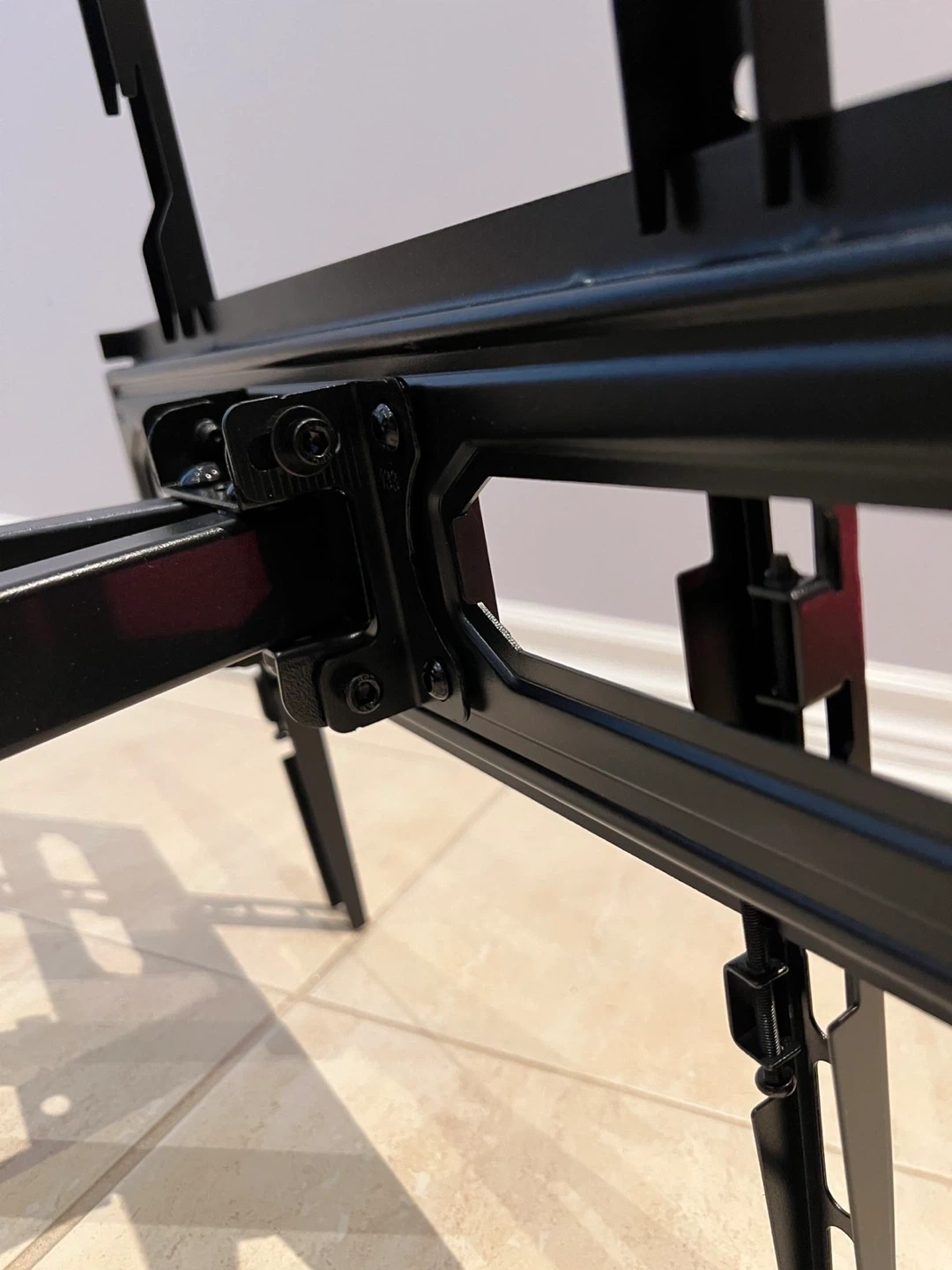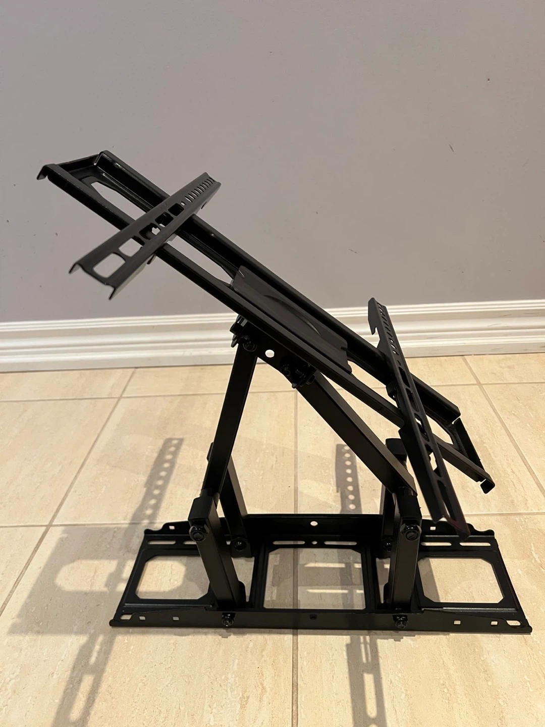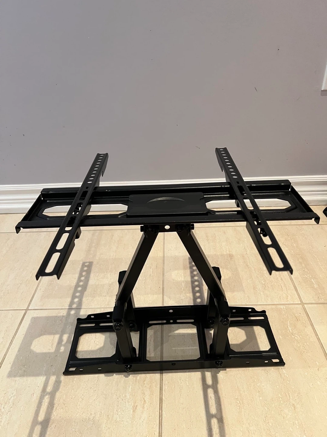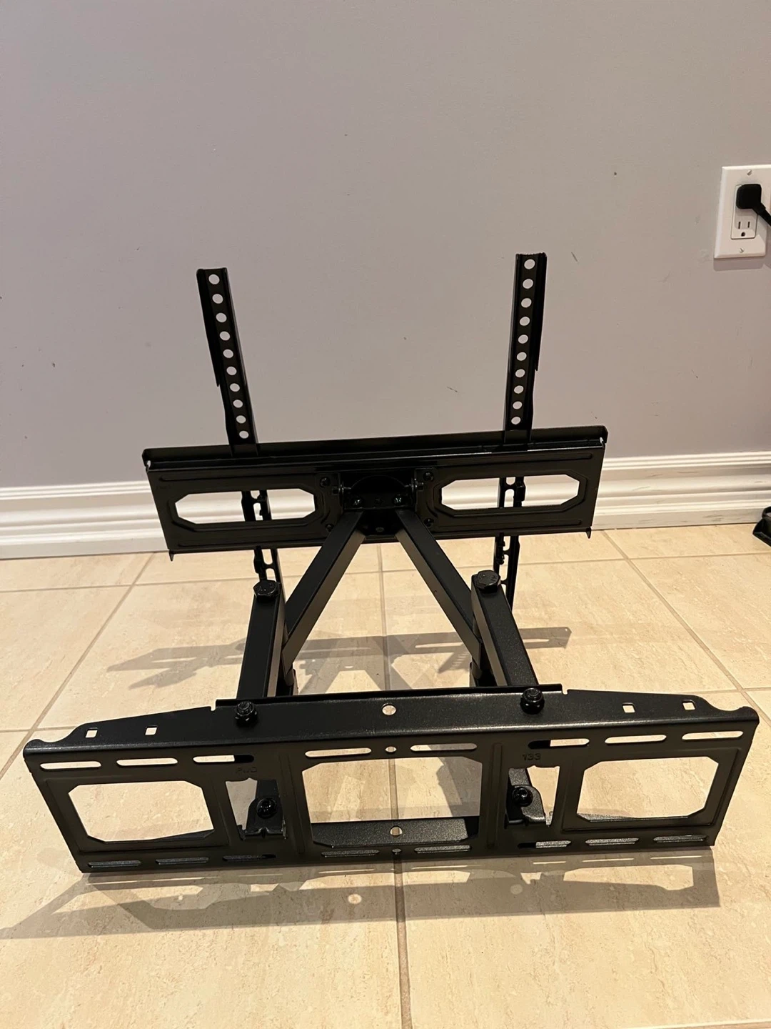 This is a black articulating TV wall mount. It's made of metal and offers adjustable viewing angles. It's suitable for mounting a television on a wall.