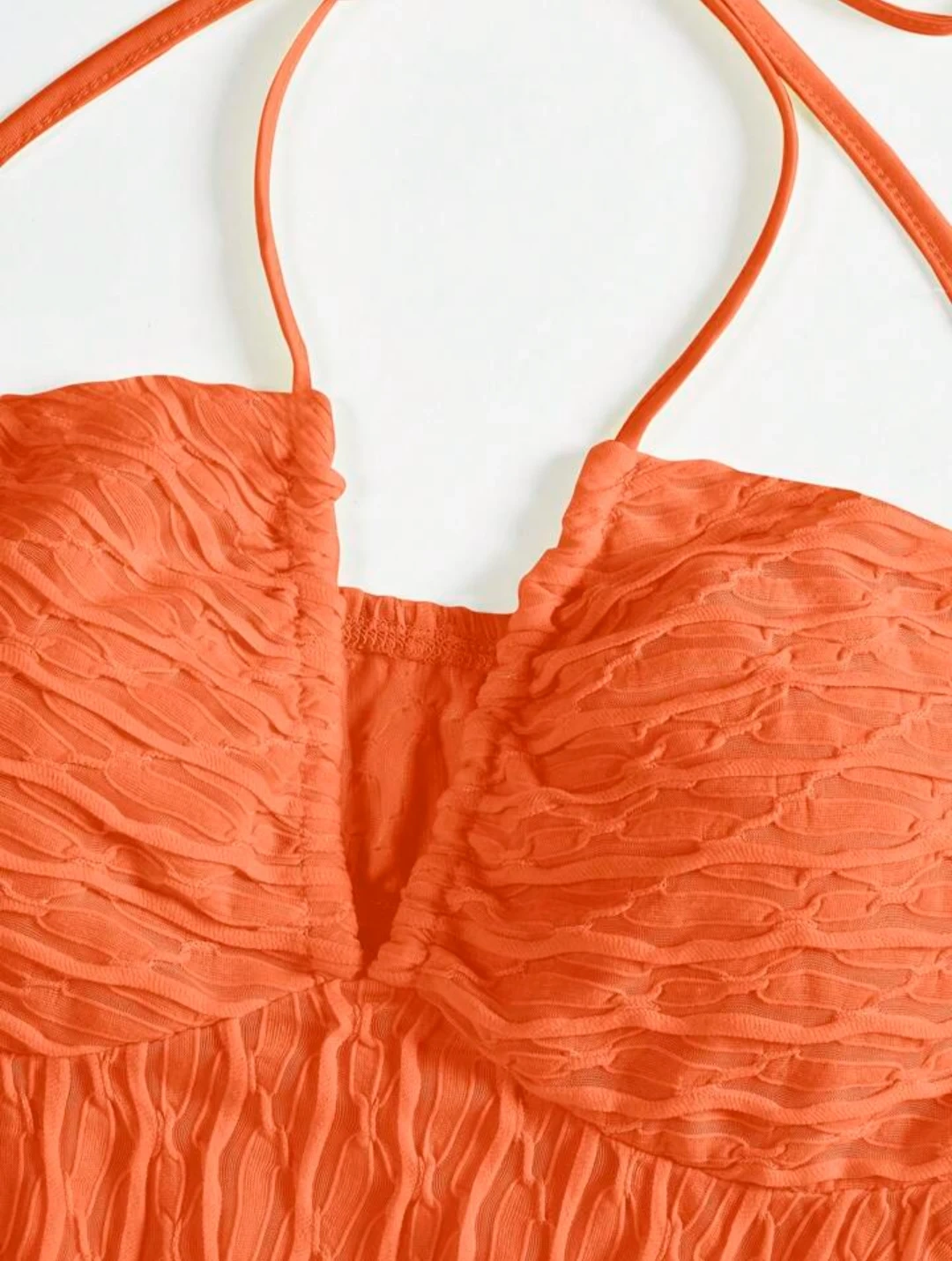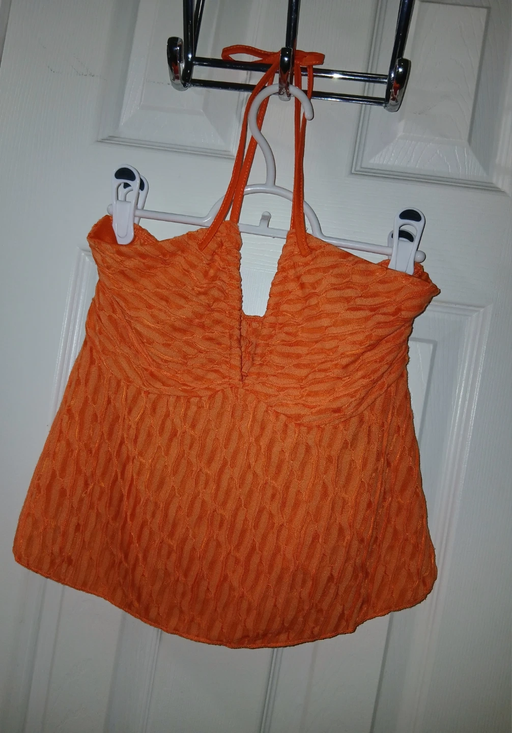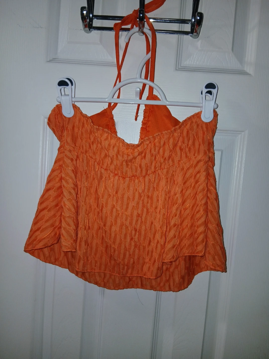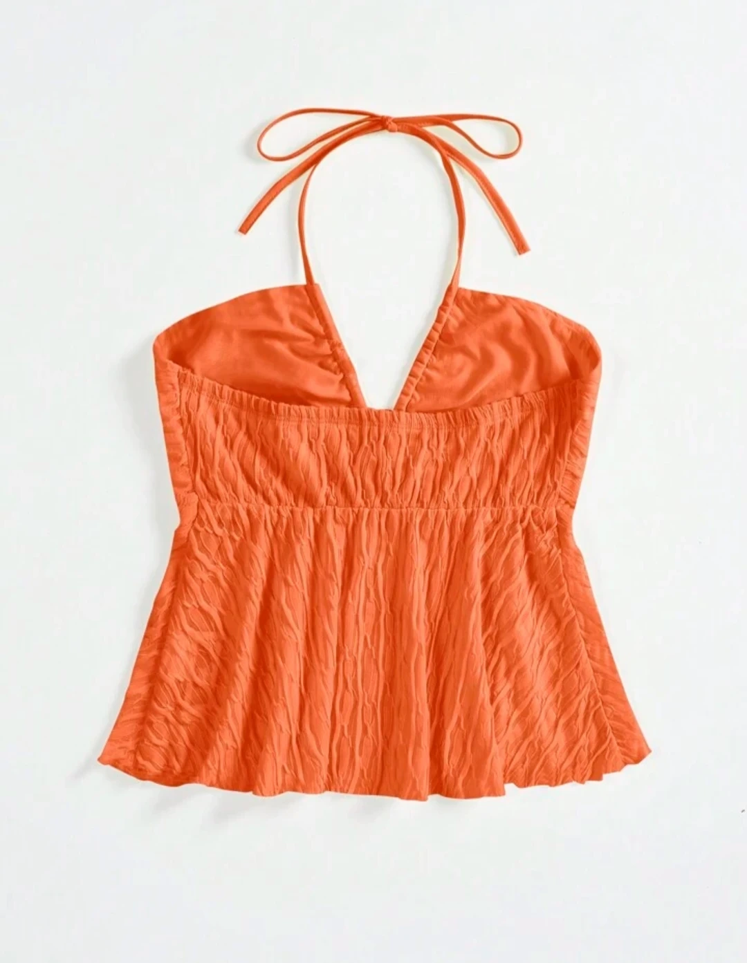 This bright orange halter top has a unique textured fabric and a tie-back closure. It features a ruched bodice and a flared peplum hem. Great for summer wear!