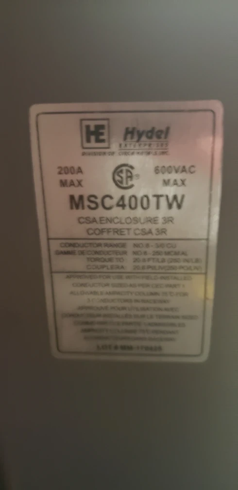 Selling a Hydel MSC400TW CSA Enclosure 3R. It's rated for 200A max and 600VAC max.