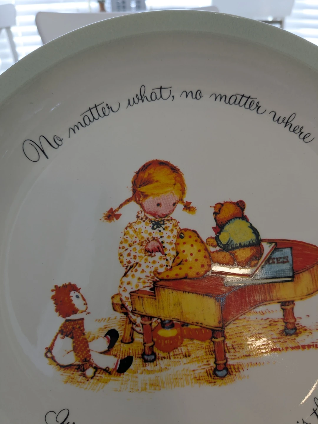 This is a decorative plate featuring a charming illustration of a girl with her teddy bear and doll. The plate has the text 'No matter what, no matter where' and 'It's always home when love is there.' It's made of ceramic.