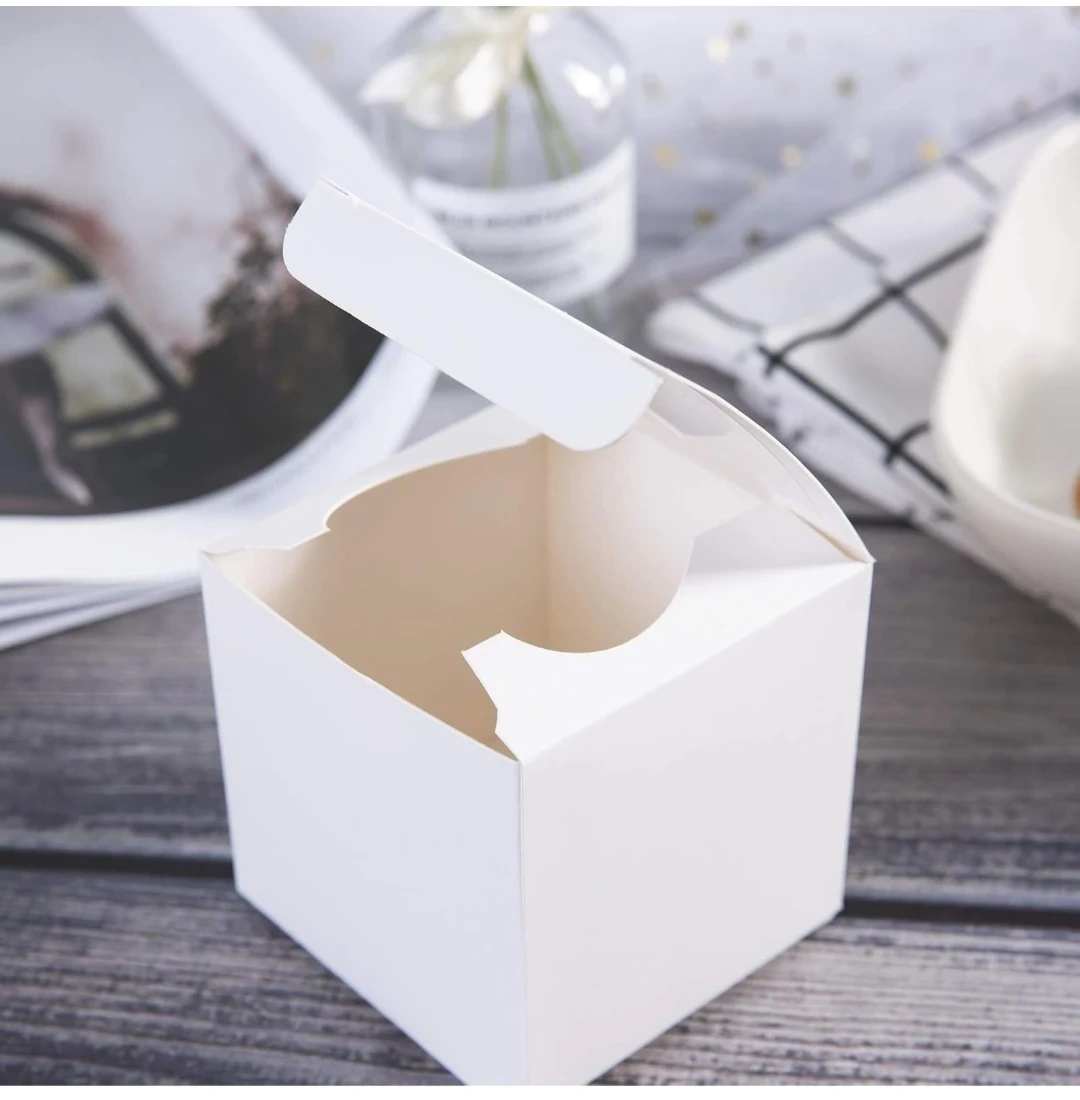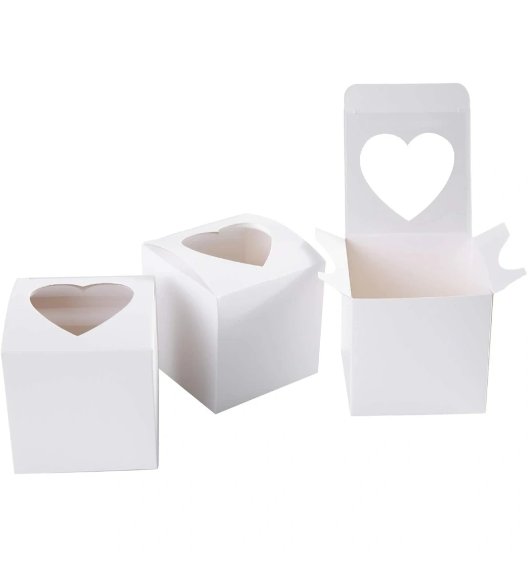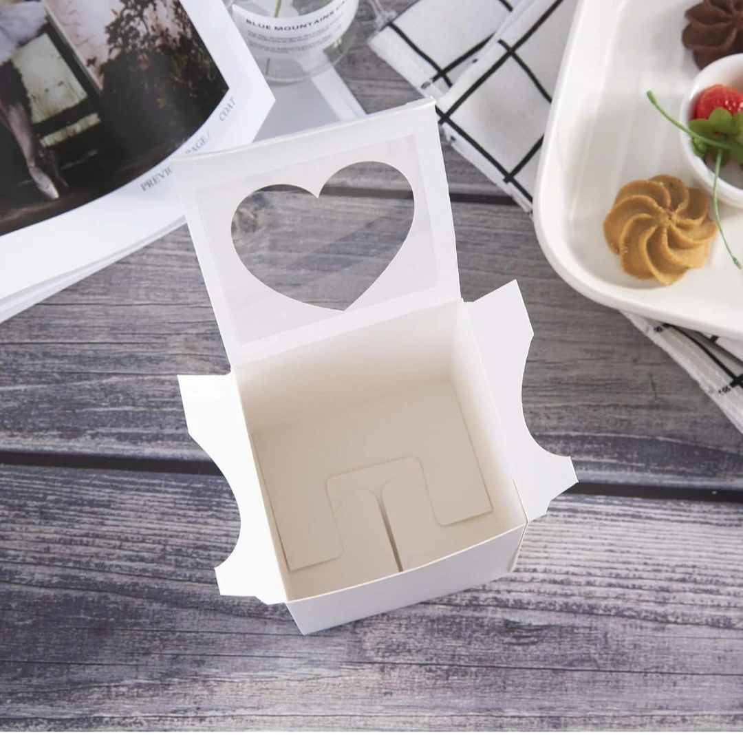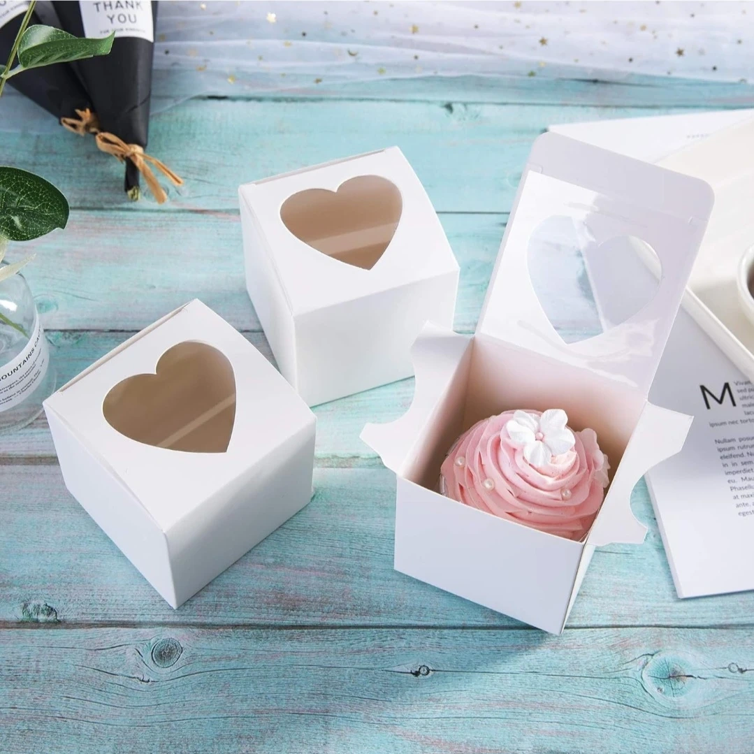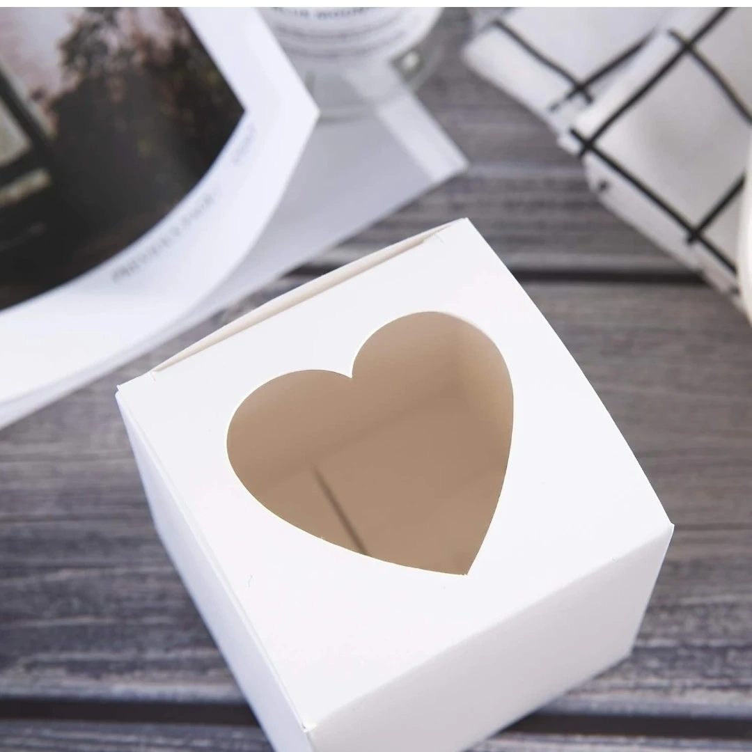 These are white paper cupcake boxes designed to hold single treats. They feature a clear window on top with a heart cutout. The boxes measure approximately 3 x 3 x 3 inches. Perfect for gifting or selling individual baked goods!