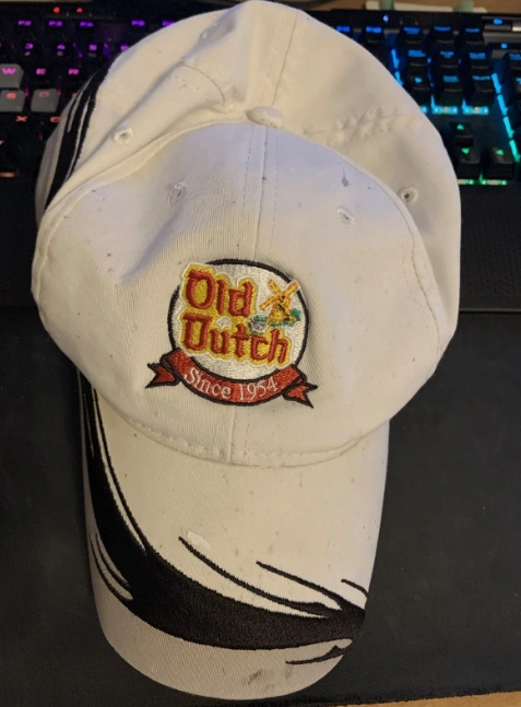 Selling a baseball cap with the Old Dutch logo. It's white with black accents and features the 'Old Dutch Since 1954' logo on the front. It's in used condition with some signs of wear, but still has lots of life left!