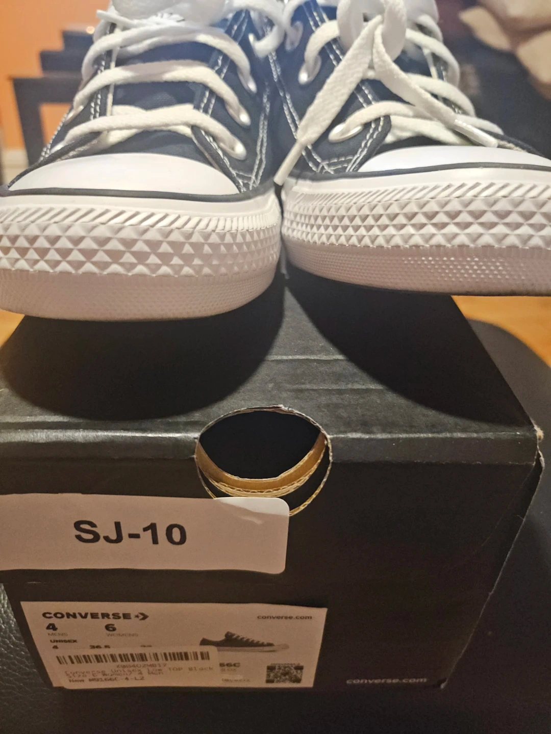 Classic black Converse Chuck Taylor low top sneakers. These are size 6 in women's and 4 in men's sizing. They're made with a canvas upper and rubber sole. Includes original box!