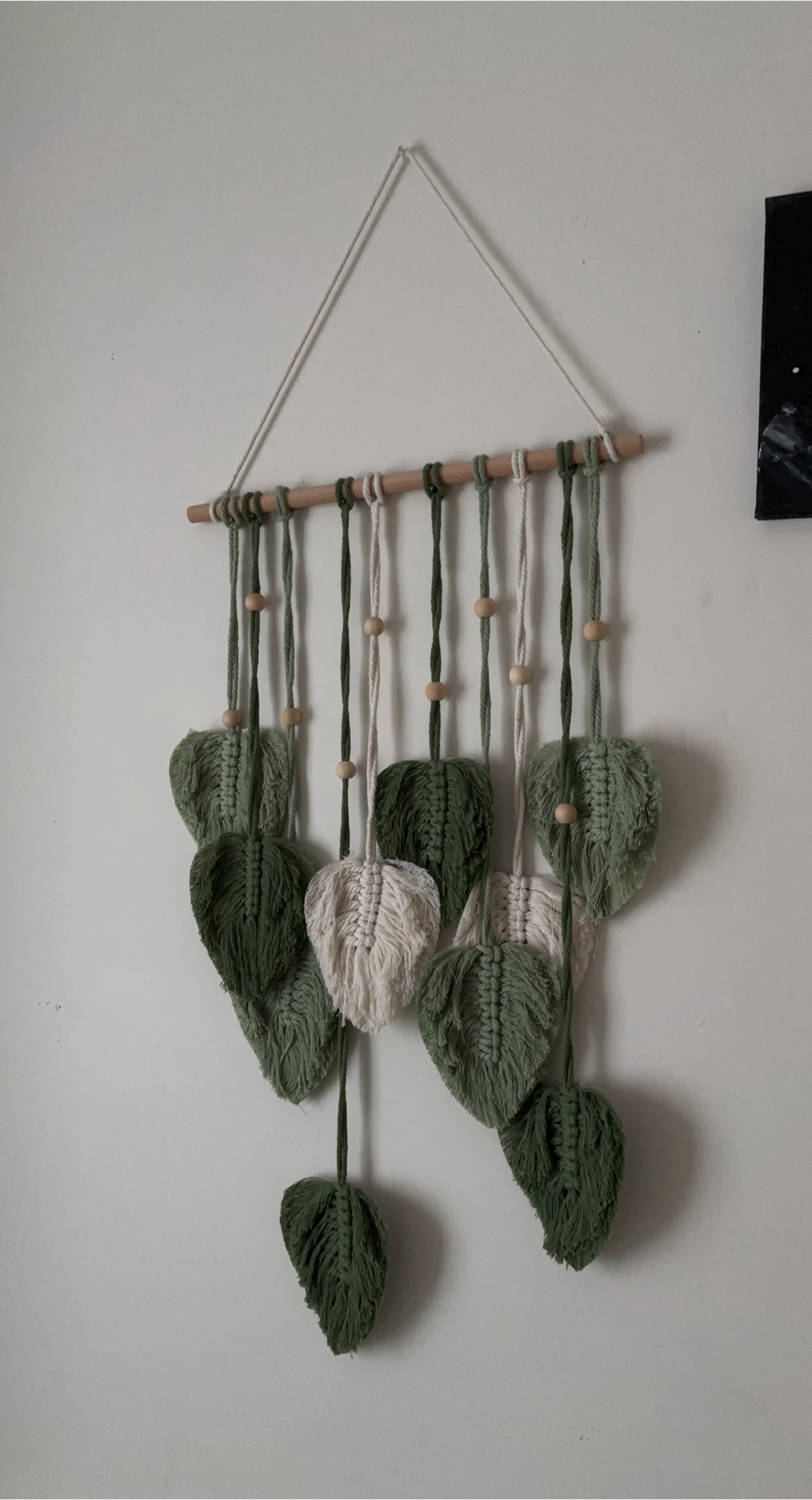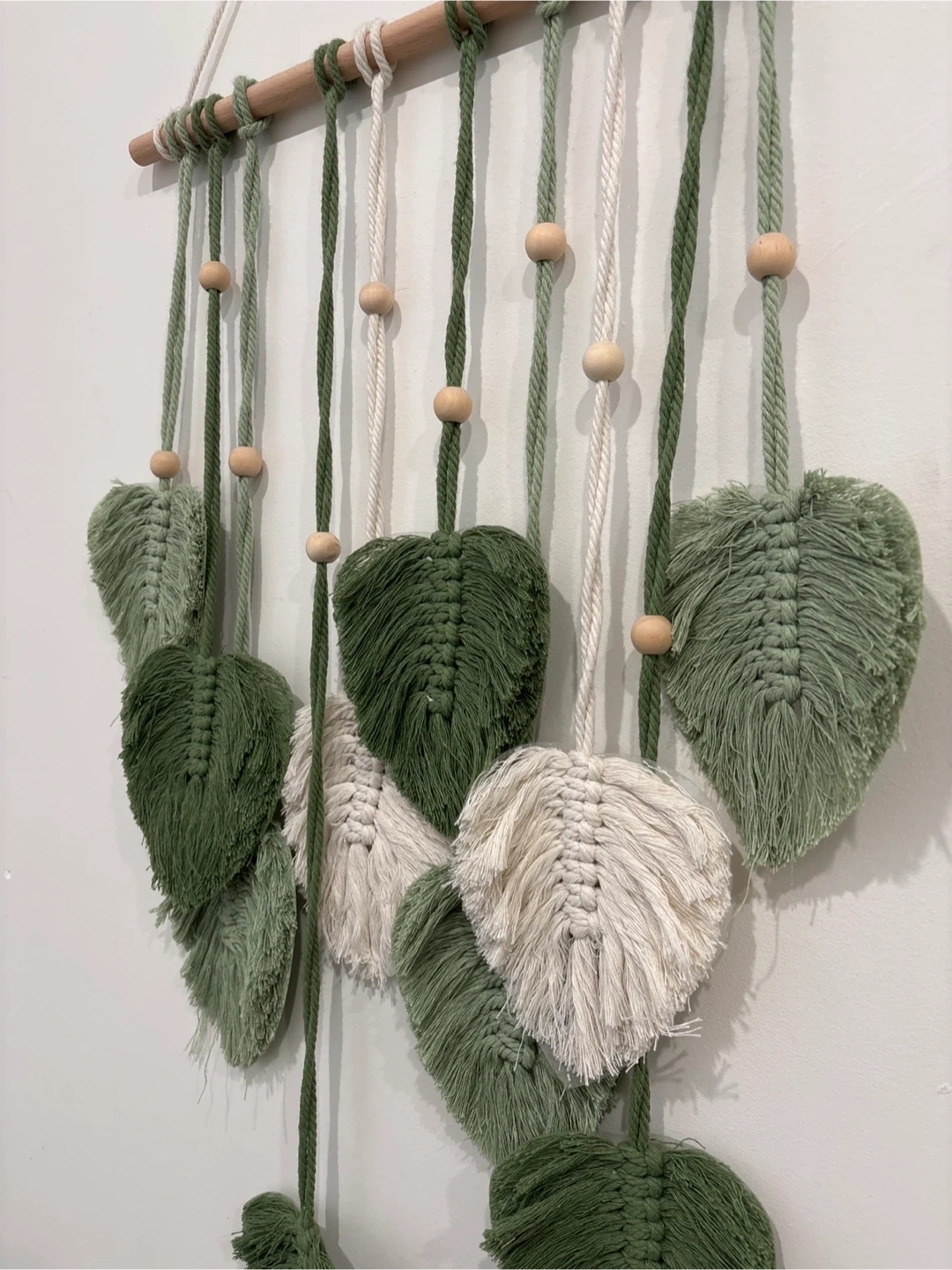 Handmade macrame wall hanging featuring green and cream leaf shapes, accented with wooden beads. It's strung on a natural wood dowel. Adds a boho touch to any room!