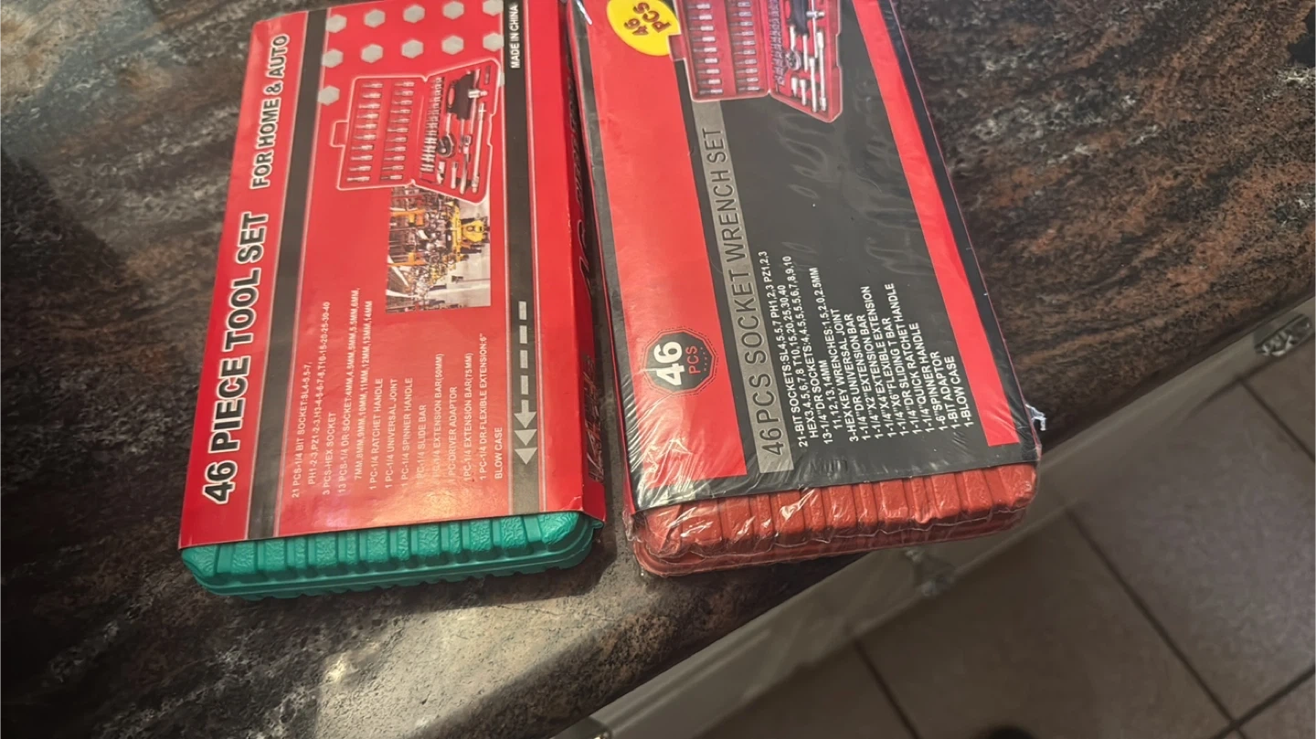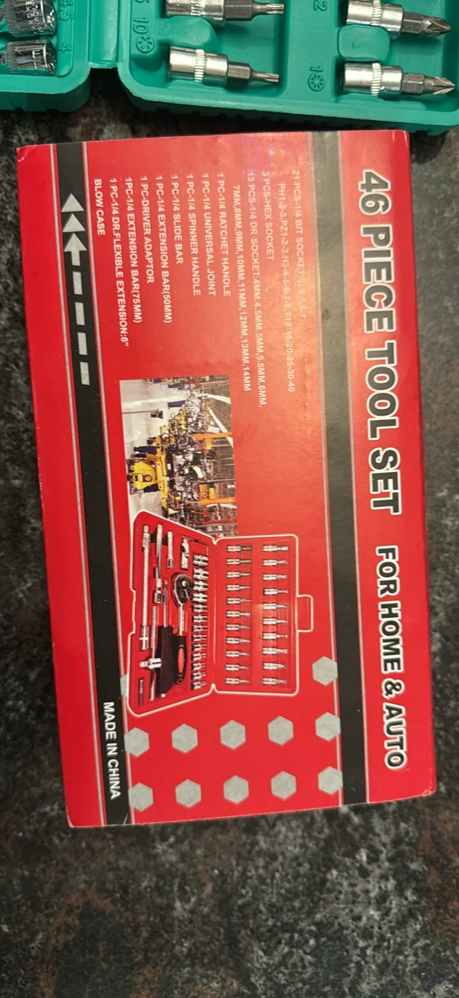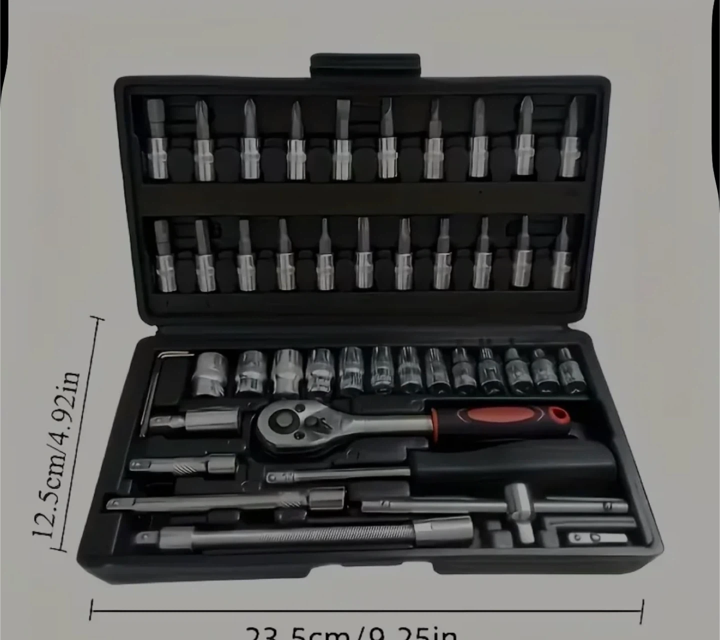 This is a 46-piece tool set for home and auto use. It includes sockets, a ratchet handle, screwdriver bits, and various adaptors. Everything comes in a convenient blow-molded case.