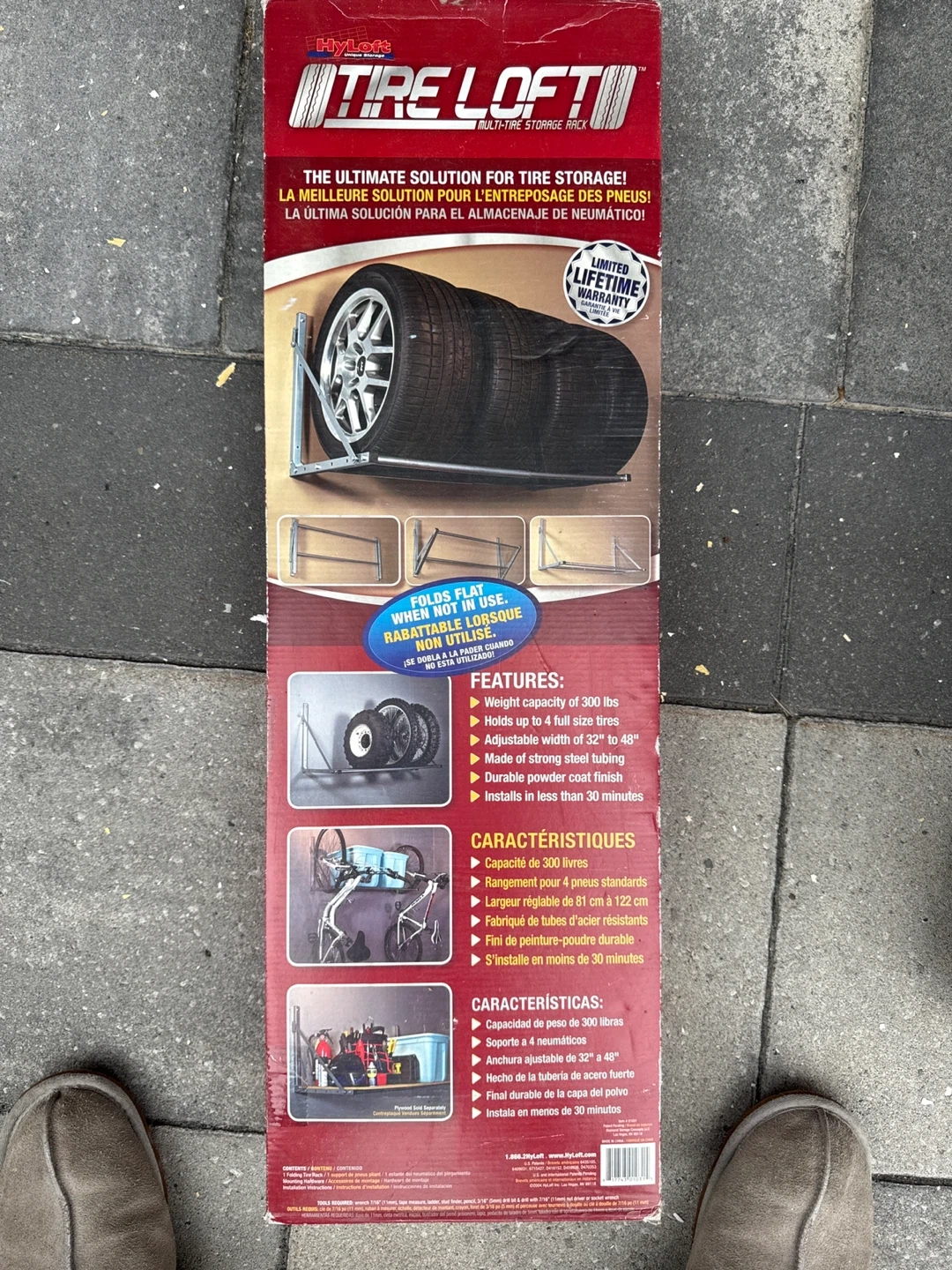 10Looking to get your tires organized? This HyLoft Tire Loft is the ultimate solution for tire storage! It folds flat when not in use, saving you space. Features: - Weight capacity of 300 lbs - Holds up to 4 full-size tires - Adjustable width of 32" to 48" - Made of strong steel tubing - Durable powder coat finish - Installs in less than 30 minutes